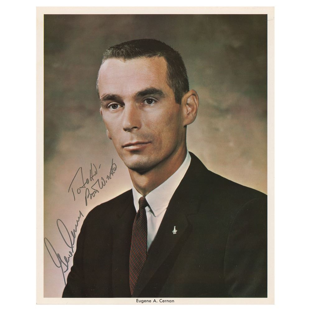 Official color 8 x 10 NASA lithograph of Cernan in a suit and tie with astronaut pin on his lapel, signed and inscribed in black felt tip, "To John, Best Wishes, Gene Cernan." In fine condition, with some small surface creases.