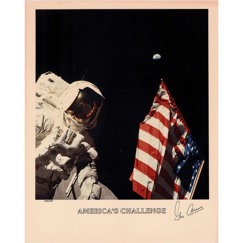 Laminated limited edition color glossy 15.5 x 19.5 photo of Harrison Schmitt next to the American flag as taken by Gene Cernan during the Apollo 17 mission, entitled 'America's Challenge,' numbered 382/500, signed in the lower border in black felt tip by Cernan. In fine condition. Accompanied by a certificate of authenticity from Galaxy Incorporated, which features a typed statement and preprinted signature of Cernan.