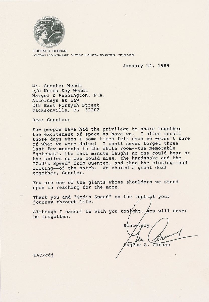 TLS, one page, 7.25 x 10.5, personal letterhead, January 24, 1989. Letter to Guenter Wendt concerning his retirement. In part: “Few people have had the privilege to share together the excitement of space as have we. I often recall those days when I some times felt even we weren’t sure of what we were doing! I shall never forget those last few moments in the white room—the memorable ‘gotchas,’ the last minute laughs no one could hear or the smiles no one could miss, the handshake and the ‘God’s Speed’ from Guenter, and then the closing—and locking—of the hatch. We shared a great deal together, Guenter. You are one of the giants whose shoulders we stood upon in reaching for the moon. Thank you and ‘God’s Speed’ on the rest of your journey through life.” In fine condition. The Guenter Wendt Collection, ex. Ken Havekotte.