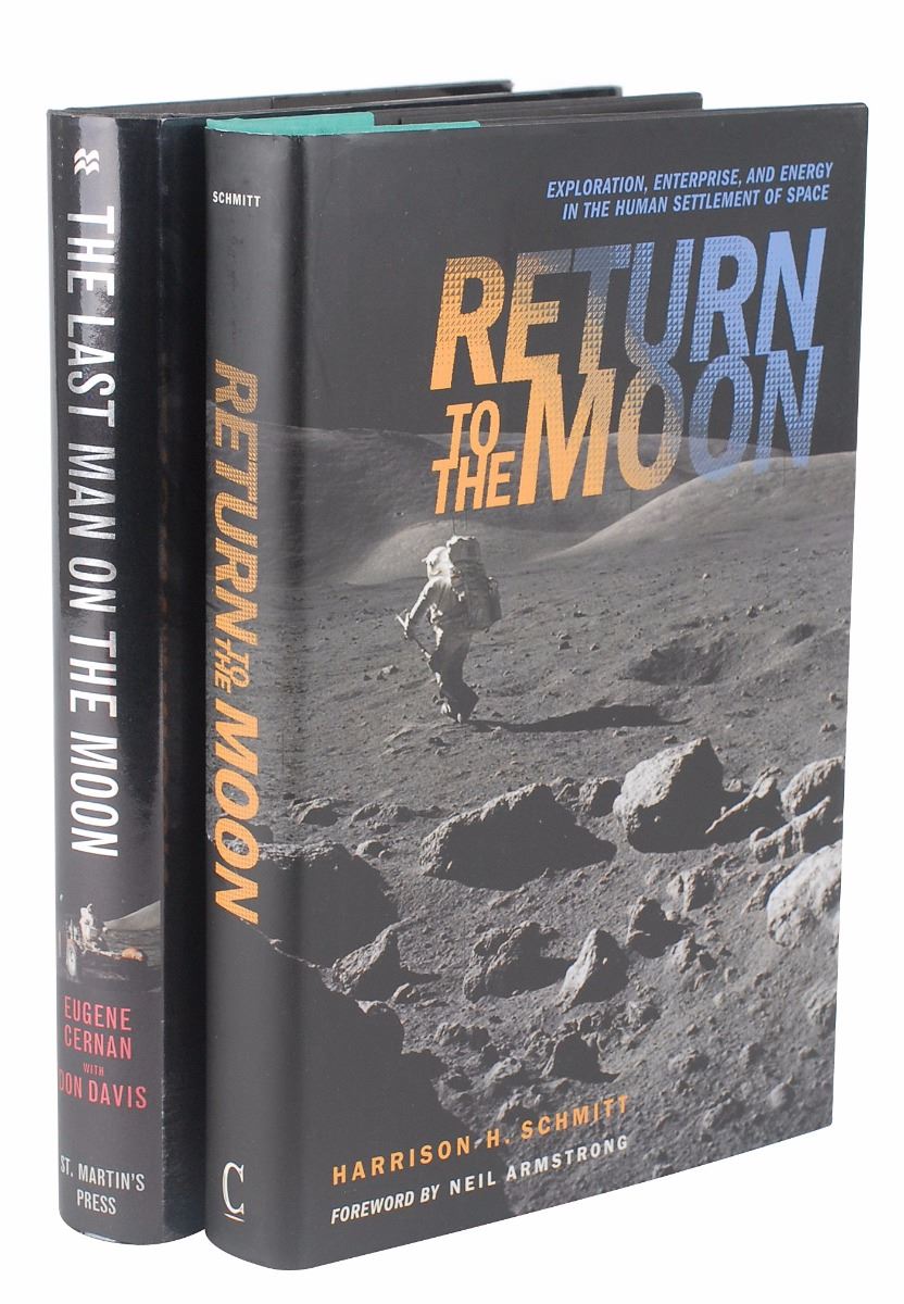 Two books: a first edition of The Last Man on the Moon, hardcover with dust jacket, signed on the title page in black ink, “Gene Cernan,” and in black felt tip, “Don Davis”; and a first edition of Return to the Moon, hardcover with dust jacket, signed on the title page in black ink, “Harrison H. Schmitt, Apollo 17.” In overall fine condition.