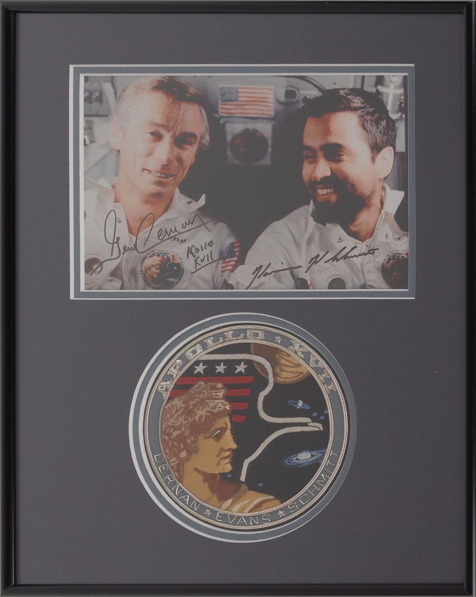Appealing color semi-glossy 9.75 x 6.5 photo of the commander and lunar module pilot of Apollo 17 during orbit, signed in black felt tip, “Gene Cernan, Apollo XVII” and “Harrison H. Schmitt.” Double-matted and framed with a unique oversized Apollo 17 mission patch to an overall size of 14.25 x 17.75. In fine condition. Originating from the Astronaut Scholarship Foundation, a portion of the proceeds for the sale of this item will be donated to the ASF.