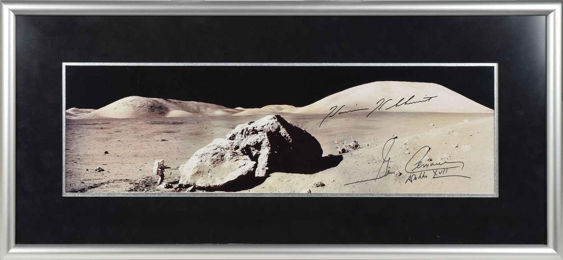 Desirable color satin-finish 23.75 x 7 panoramic photo of the Apollo 17 excursion to the 'split rock' on the lunar surface, signed in black felt tip by the mission's two moonwalkers, "Gene Cernan, Apollo XVII" and "Harrison H. Schmitt." Nicely double-matted and framed to an overall size of 31 x 14.5. In fine condition. Accompanied by two certificates of authenticity from Novaspace.