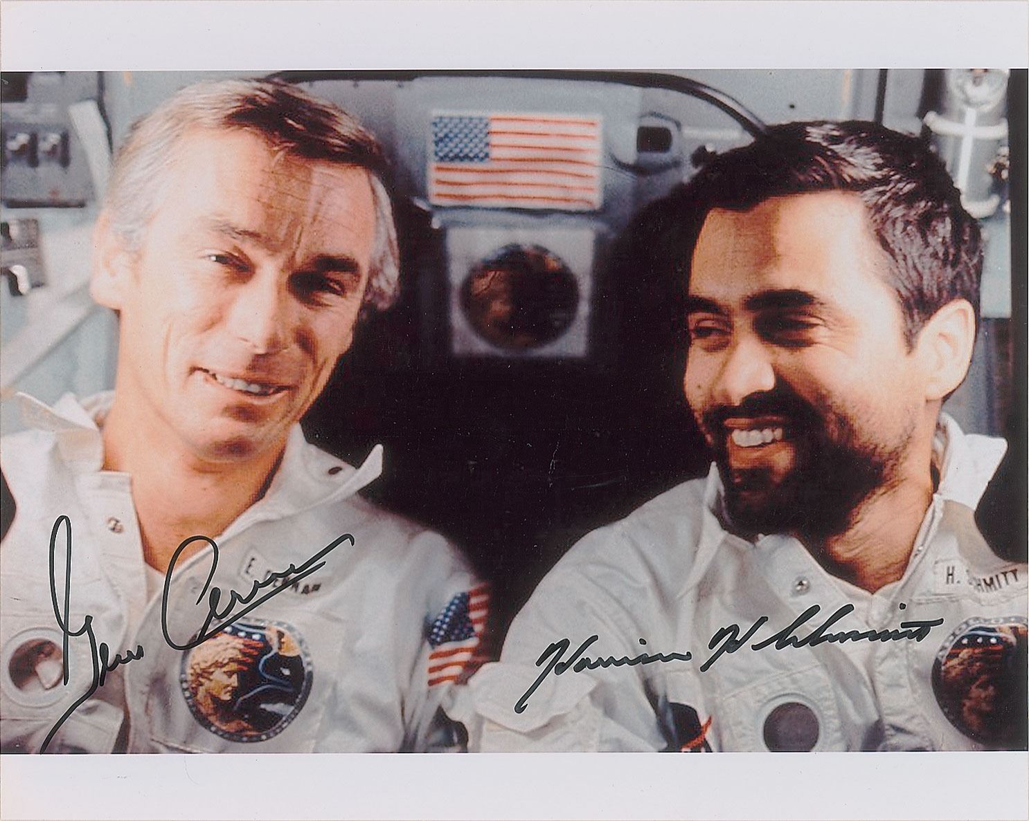 Color semi-glossy 10 x 8 photo of Gene Cernan and Harrison Schmitt during the Apollo 17 mission, signed by both in black felt tip. Reverse bears an affixed label from the Astronaut Scholarship Foundation certifying that the autographs were signed for the organization. In very fine condition.