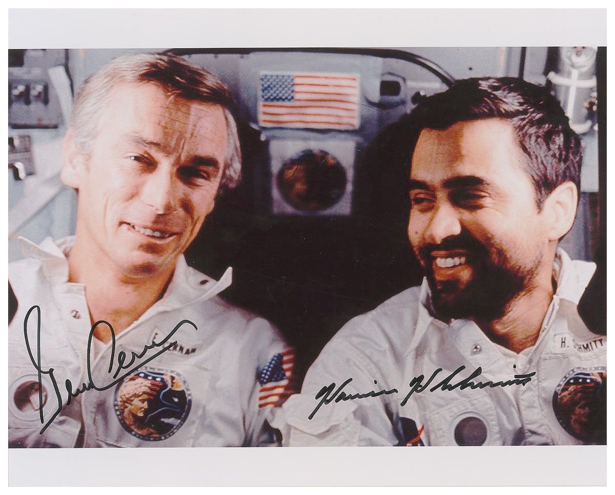 Jovial color satin-finish 10 x 8 photo of Cernan and Schmitt sharing a moment in the module, signed in black felt tip by both. In fine condition. Certificate of authentication from the Astronaut Scholarship Foundation affixed to the reverse.