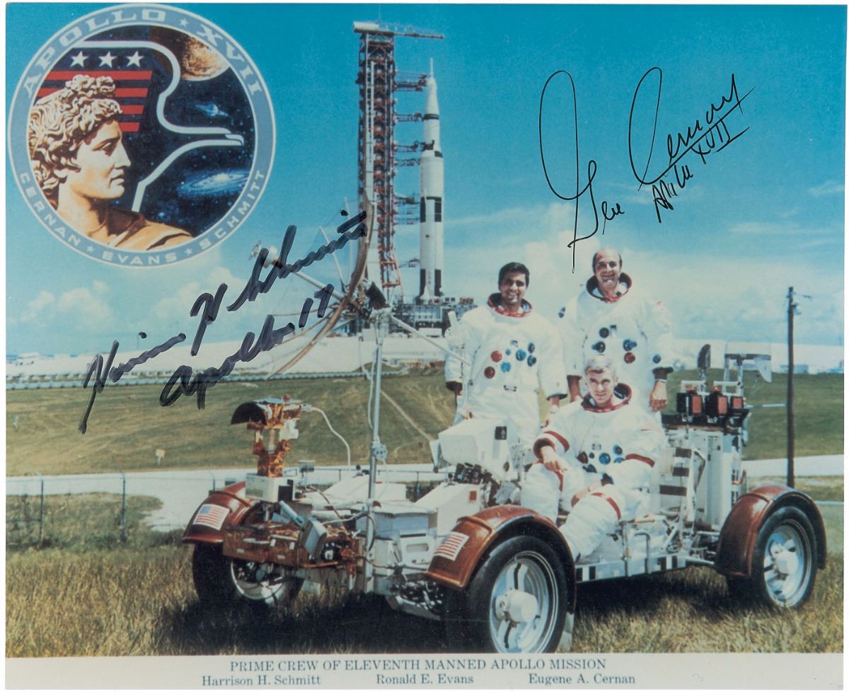 Color glossy 9.5 x 7.75 photo of the Apollo 17 crew posing in their white space suits near the lunar rover, signed in black felt tip, “Harrison H. Schmitt, Apollo 17,” and in black ink, “Gene Cernan, Apollo XVII.” In fine condition, with evenly trimmed edges and a slightly blurred quality to the image.