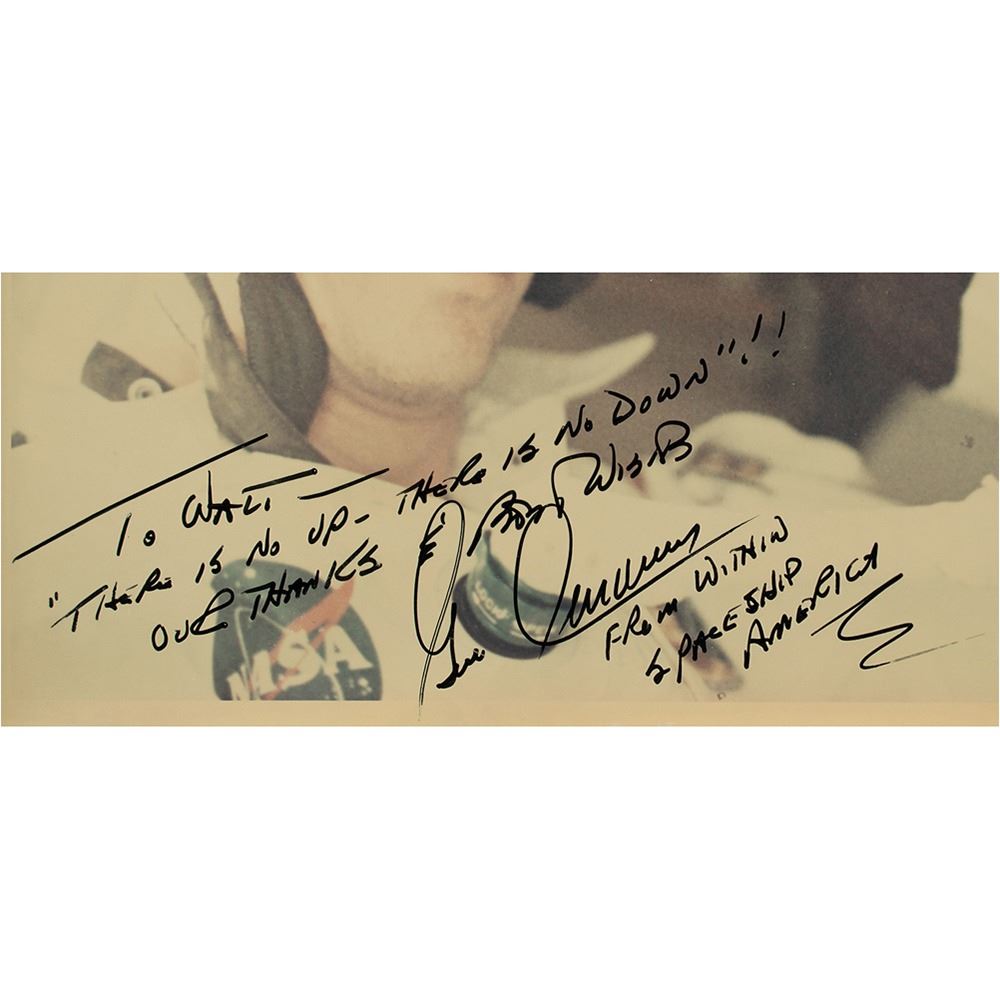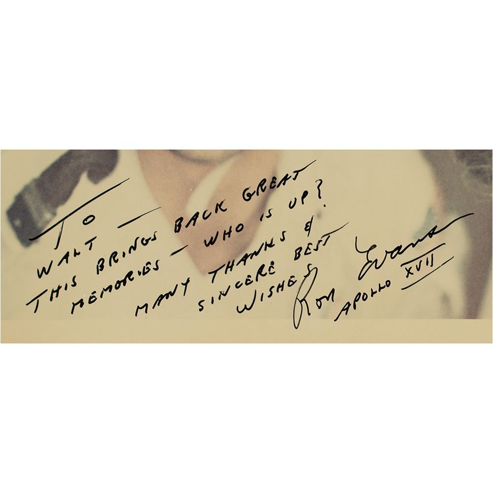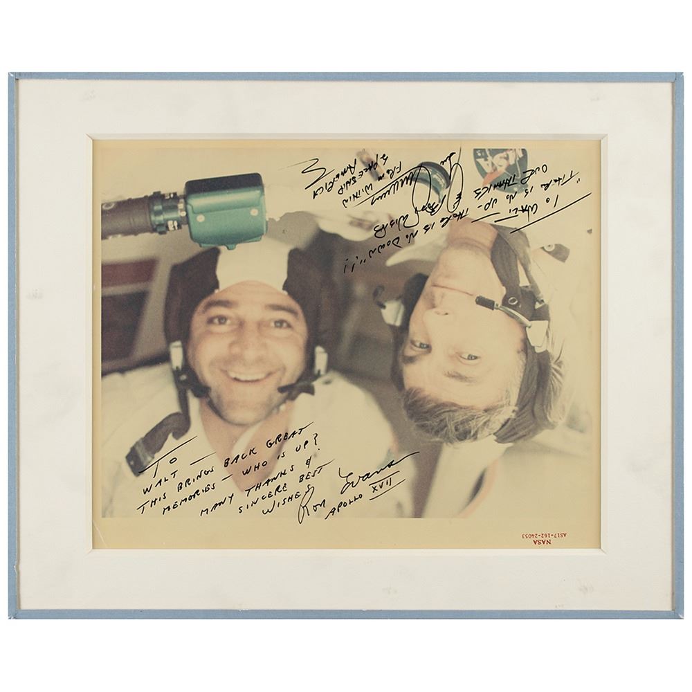 Fantastic official color glossy 10 x 8 red-numbered NASA photo of Cernan and Evans inside the Apollo 17 spacecraft, signed and inscribed in black felt tip, "To Walt-'There is no up-there is no down!' Our thanks and best wishes, Gene Cernan, From Within Spaceship America" and "To Walt-This brings back great memories-who is up? Many thanks & sincere best wishes, Ron Evans, Apollo XVII." Reverse bears purple NASA caption text and "A Kodak Paper" watermarks. Matted to an overall size of 13 x 10.5. In fine condition, with a small crease to an upper corner.