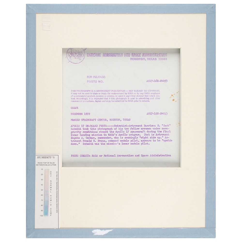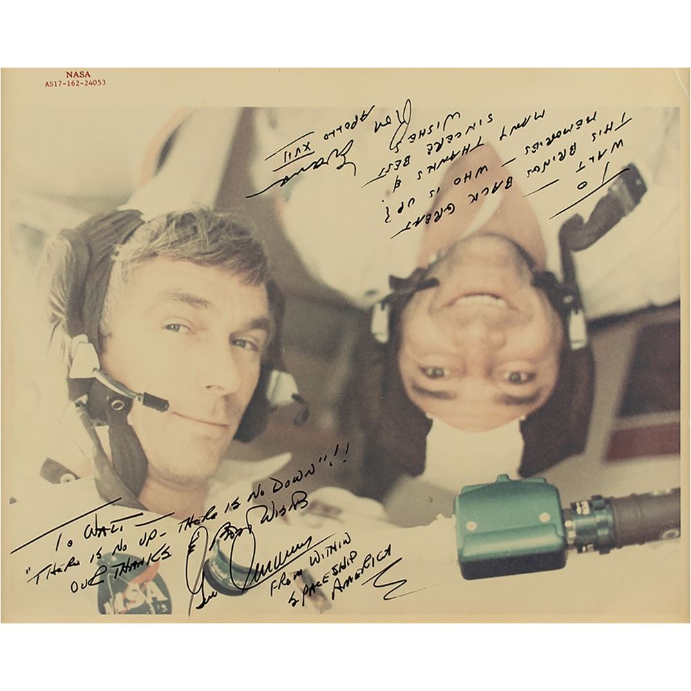 Fantastic official color glossy 10 x 8 red-numbered NASA photo of Cernan and Evans inside the Apollo 17 spacecraft, signed and inscribed in black felt tip, "To Walt-'There is no up-there is no down!' Our thanks and best wishes, Gene Cernan, From Within Spaceship America" and "To Walt-This brings back great memories-who is up? Many thanks & sincere best wishes, Ron Evans, Apollo XVII." Reverse bears purple NASA caption text and "A Kodak Paper" watermarks. Matted to an overall size of 13 x 10.5. In fine condition, with a small crease to an upper corner.