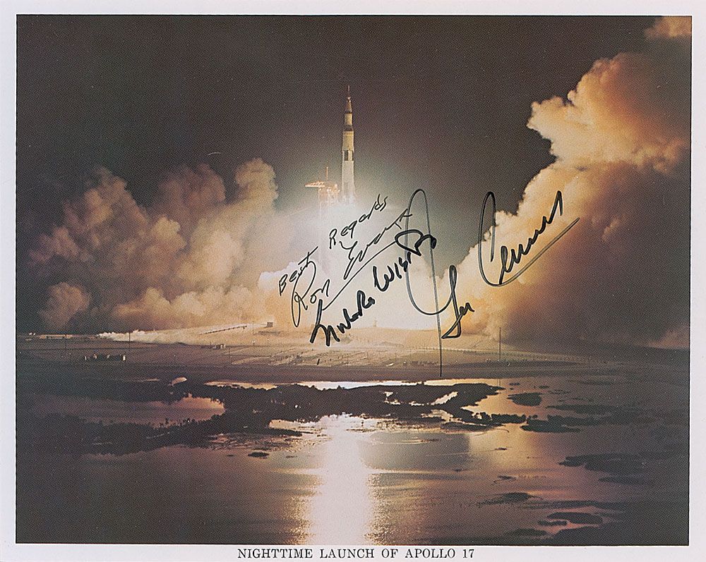 Color 10 x 8 NASA photo of the Apollo 17 launch, signed in black felt tip by Cernan and Evans. In fine condition.