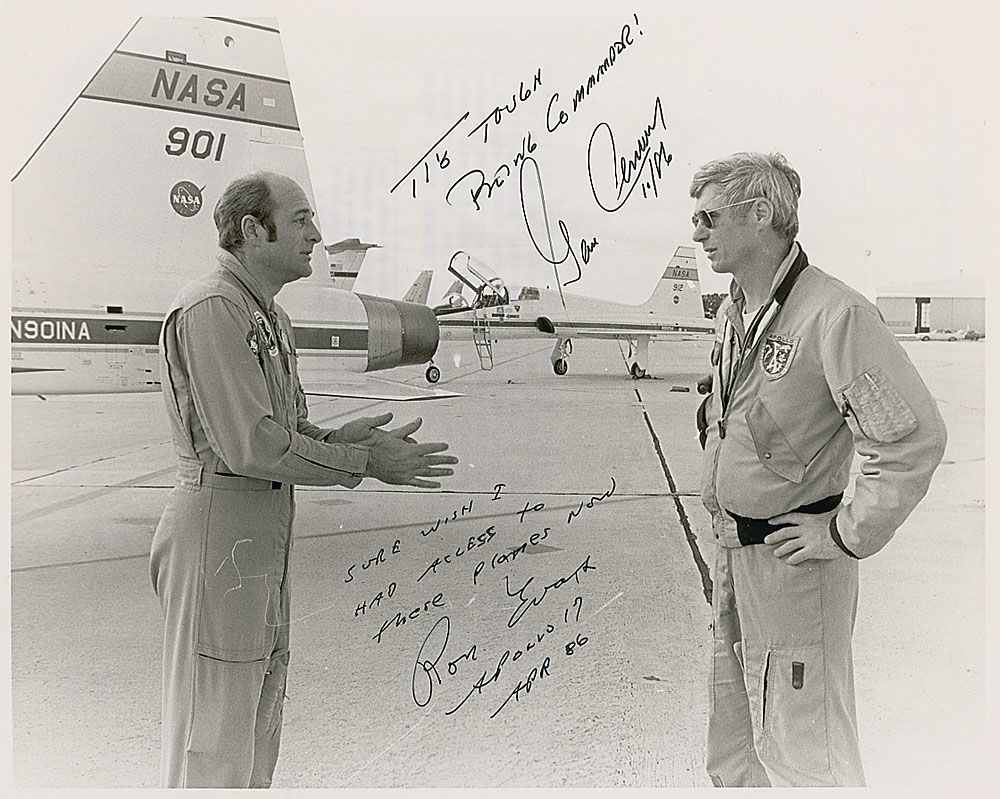Official glossy 10 x 8 NASA photo of Cernan and Evans having a discussion on the tarmac, signed in black felt tip, “It’s tough being commander! Gene Cernan, 10/86,” and “Sure wish I had access to these planes now, Ron Evans, Apollo 17, Apr. 86.” In fine condition. A very uncommon training image. From the Leslie Cantwell collection.