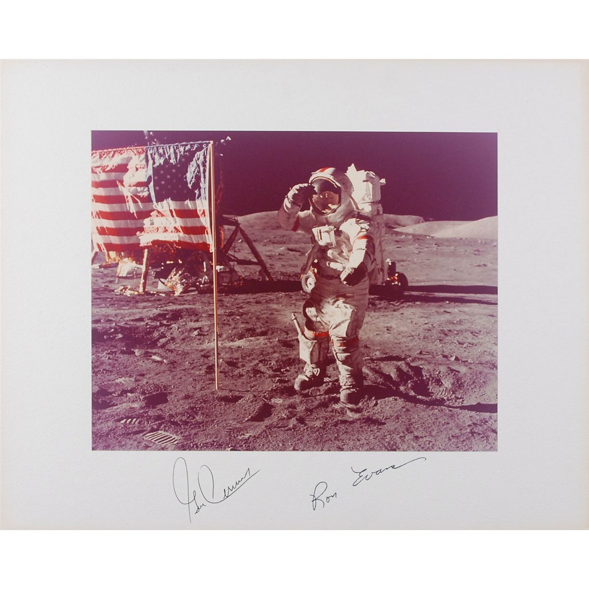 Fantastic oversized color 13.5 x 10.75 photo of Gene Cernan saluting the American flag on the lunar surface, affixed to a 20 x 16 mount, signed on the mount in black ink by Gene Cernan and Ron Evans. In fine condition.