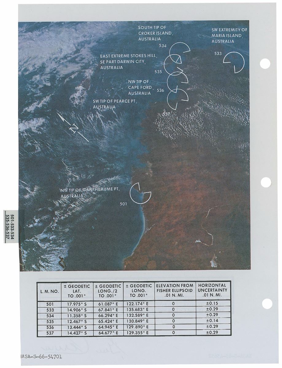 Unusual double-sided page flown on the Apollo 10 mission featuring a color photographic map of Earth as seen from space, 7.5 x 10.5, signed and flight-certified in the lower right in blue ballpoint, “Flown to the Moon on Apollo X, Gene Cernan.” A tab affixed to the right edge reads, “501-533-534, 535-536-537,” and the signed side of the page features an image of Australia with key locations identified, and table listing latitude and longitude. The opposing side has a much closer view of the northern part of the continent with a similar table of coordinates below. In fine condition. Accompanied by a data CD and certificate of authenticity attesting to the page’s provenance. With its vibrant pictures of Earth this page holds special visual appeal, as flown checklists and manual pages are rarely found with such large, colorful images.