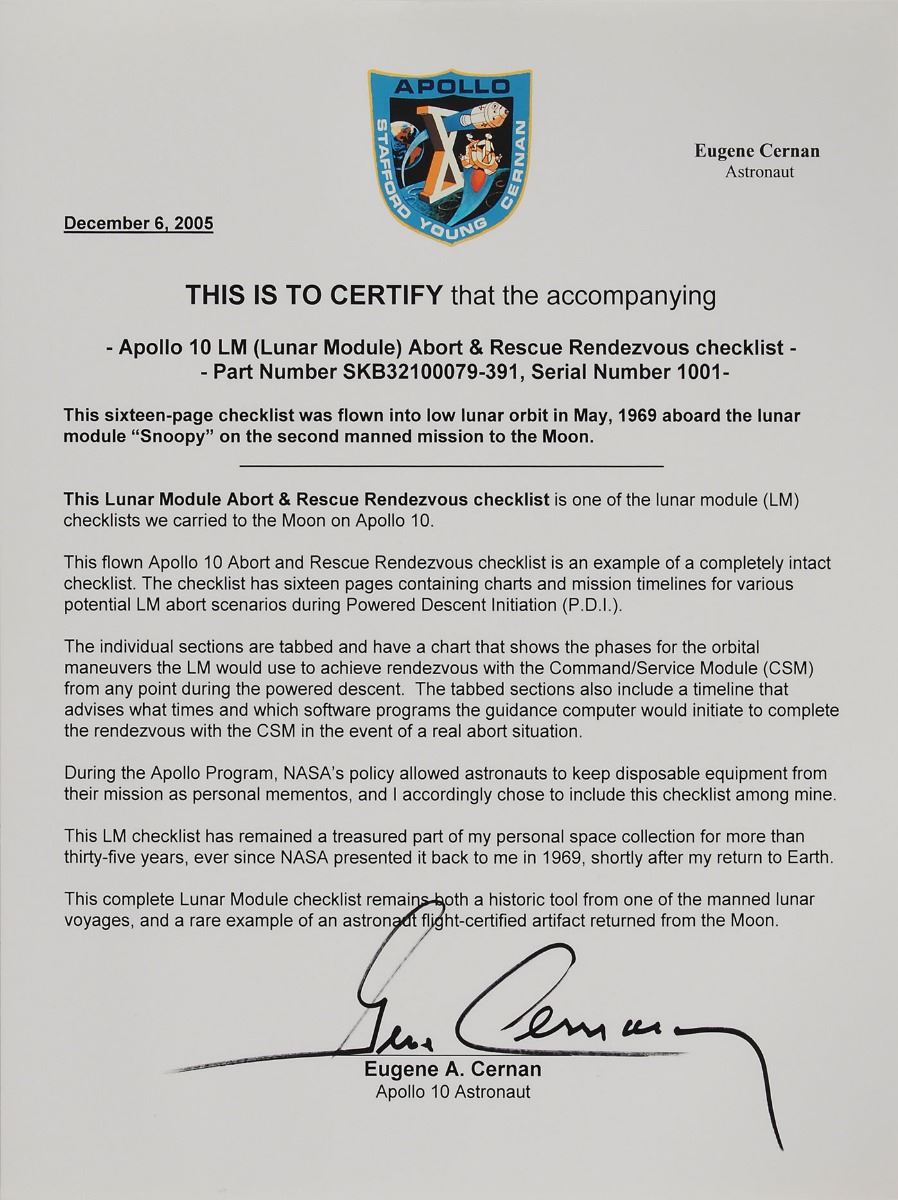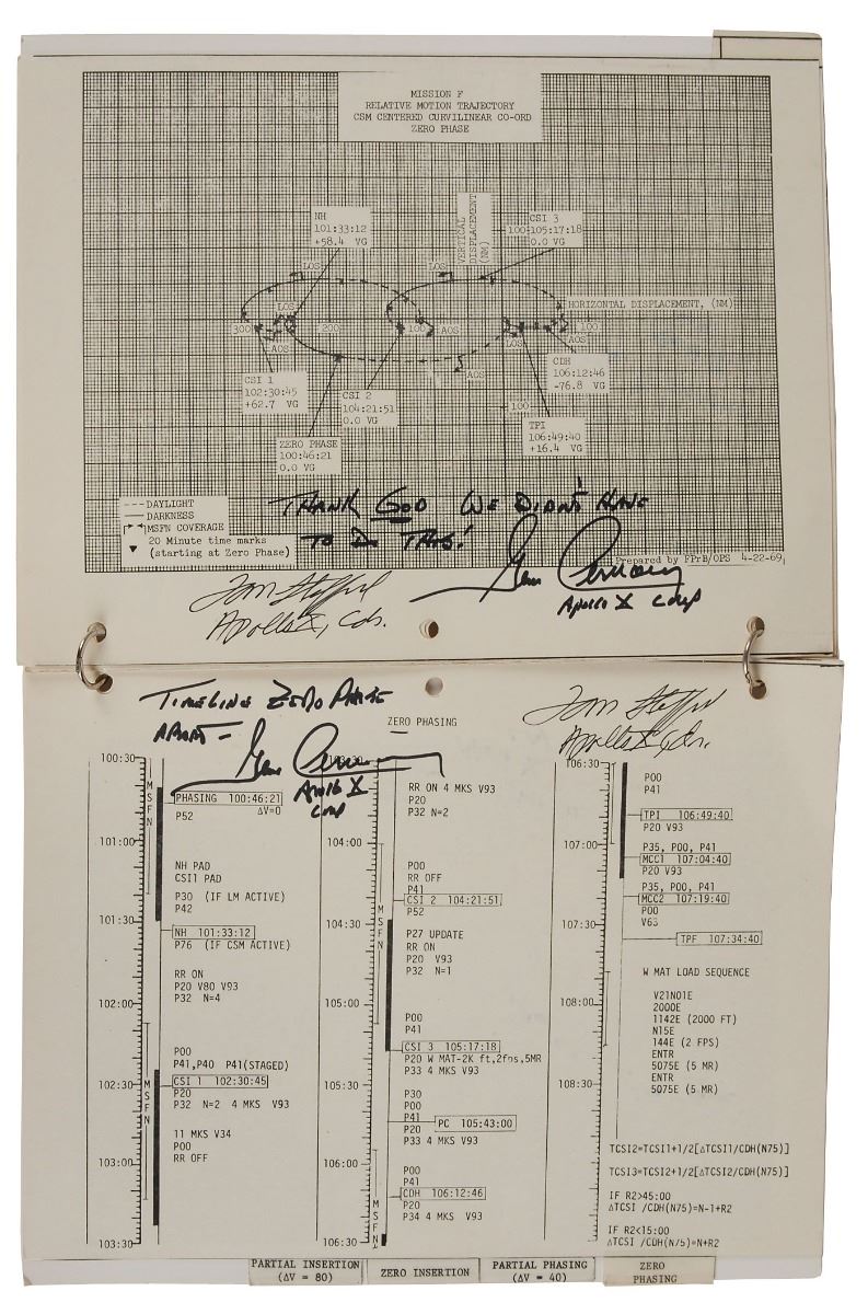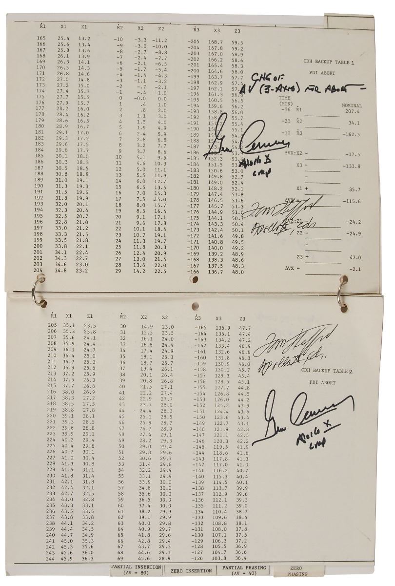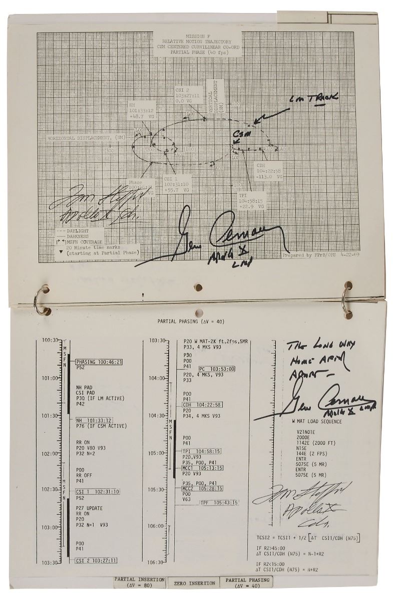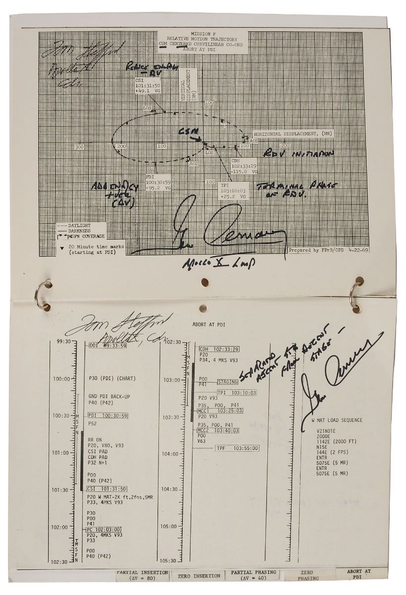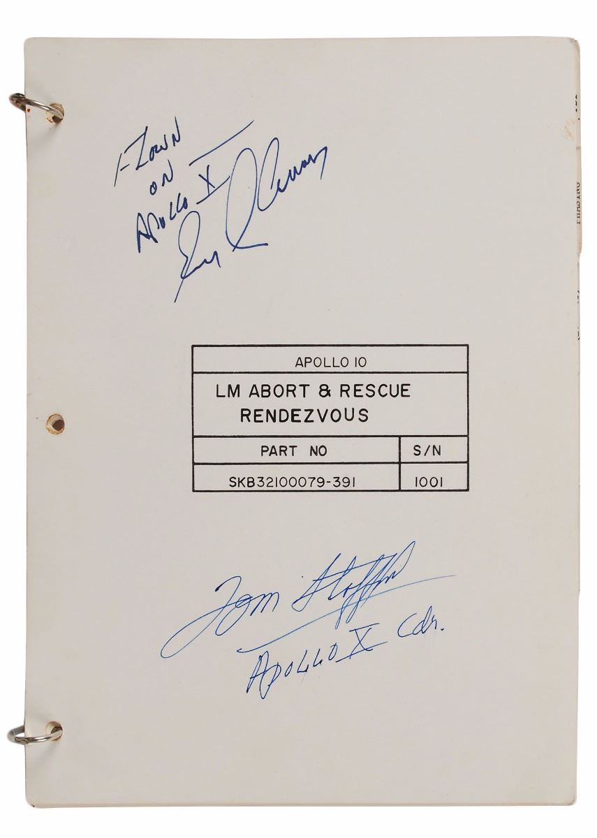 Gene Cernan’s ring-bound flown complete LM Abort & Rescue Rendezvous manual carried aboard lunar module Snoopy during the Apollo 10 mission, 8.5 x 10.5, 16 pages, signed and flight certified on the front cover in black felt tip, “Flown on Apollo X, Eugene Cernan,” and in blue ink, “Tom Stafford, Apollo X Cdr.” Additionally, twelve pages of the manual, Part No. SKB32100079–391, S/N 1001, have been signed in black ink and felt tip by Stafford and Cernan, with Stafford adding “Apollo X, Cdr.” to each signature, and Cernan adding “Apollo X LMP”; Cernan also adds brief page-specific notes to the majority of signed pages. The manual itself contains charts and mission timelines for various potential LM abort scenarios during powered descent initiation, with each section individually tabbed as follows: “Abort at PDI,” “Zero Phasing,” “Partial Phasing,” “Zero Insertion,” and “Partial Insertion.” In fine condition, with some expected wear from use. Accompanied by a signed 2005 letter of certification from Cernan, in part: “This Lunar Module Abort & Rescue Rendezvous checklist is one of the lunar module (LM) checklists we carried to the Moon on Apollo 10…[It] has remained a treasured part of my personal space collection for more than thirty-five years, ever since NASA presented it back to me in 1969, shortly after my return to Earth.” Also accompanied by two photos of Cernan, one showing him signing the certificate, and the other holding this very manual.