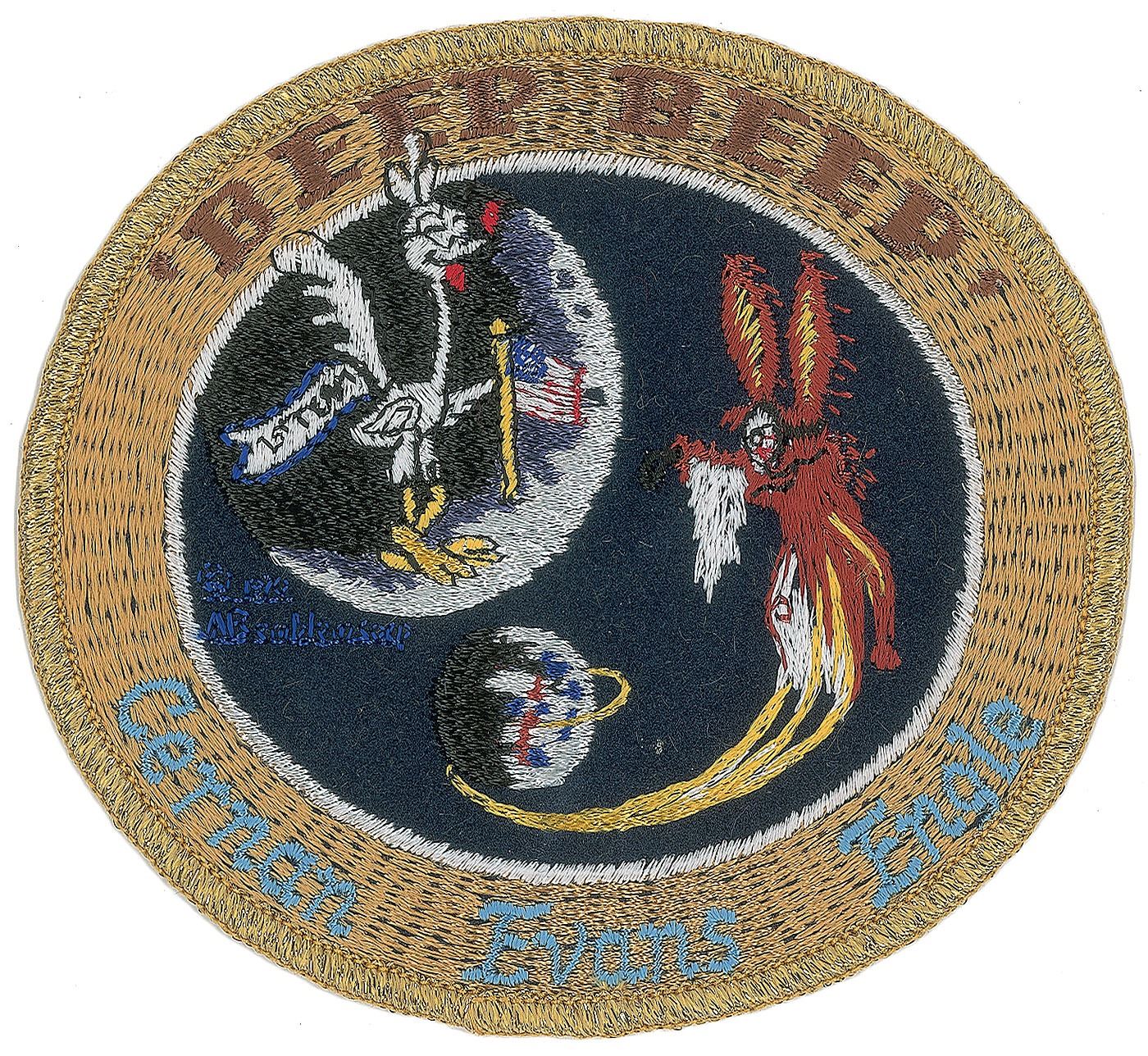Flown embroidered Apollo 14 backup crew patch featuring the Road Runner and Wile E. Coyote cartoon characters, measuring 4? in diameter, with "Beep Beep" at the top and the surnames of the backup crew members along the bottom, signed twice and flight-certified on the reverse in black felt tip by the backup commander, "Flown to the Moon, Gene Cernan, Gene Cernan," and also signed by the mission's LMP, "Edgar Mitchell." Reverse also bears an affixed A-B Emblem Corp. label. In fine condition.