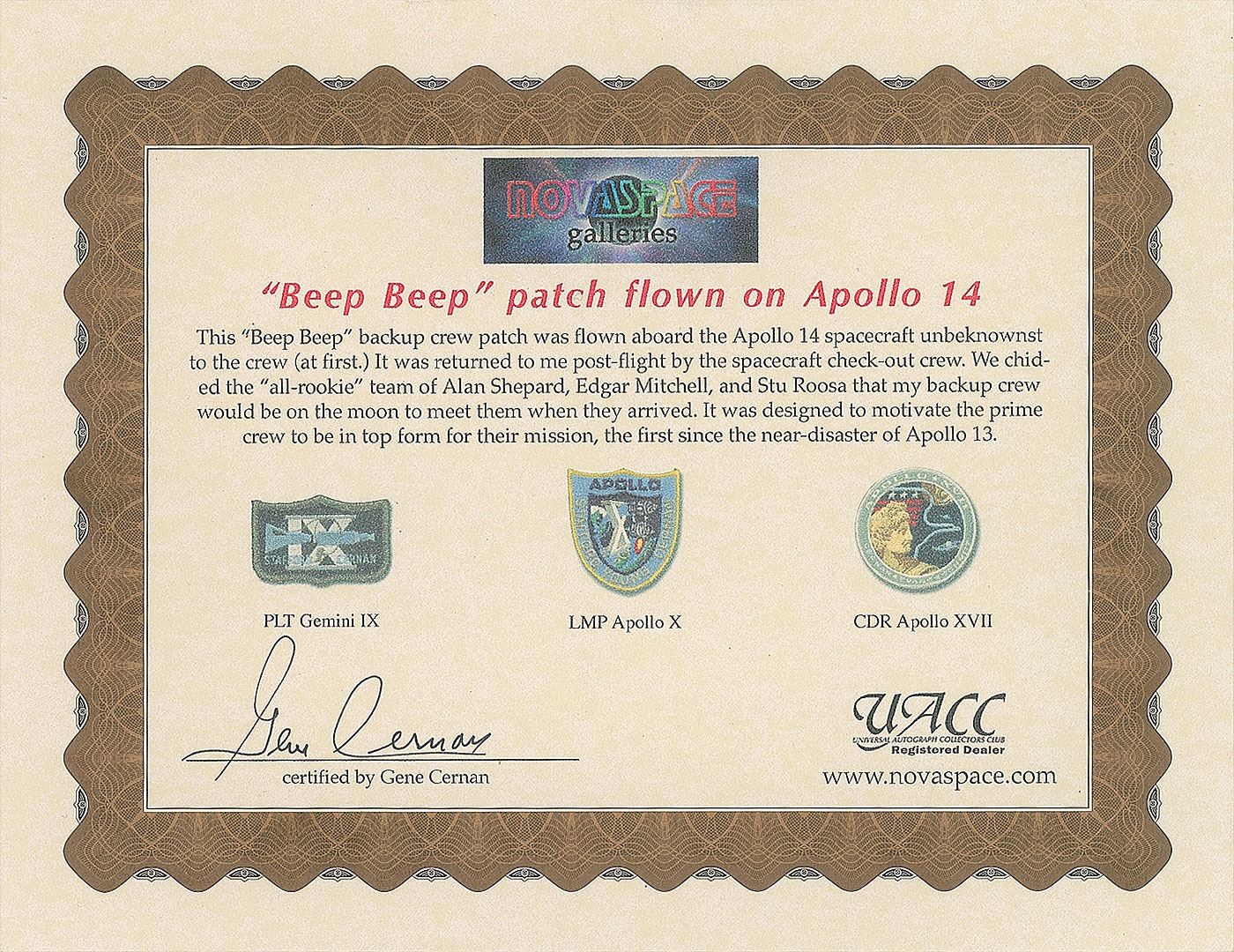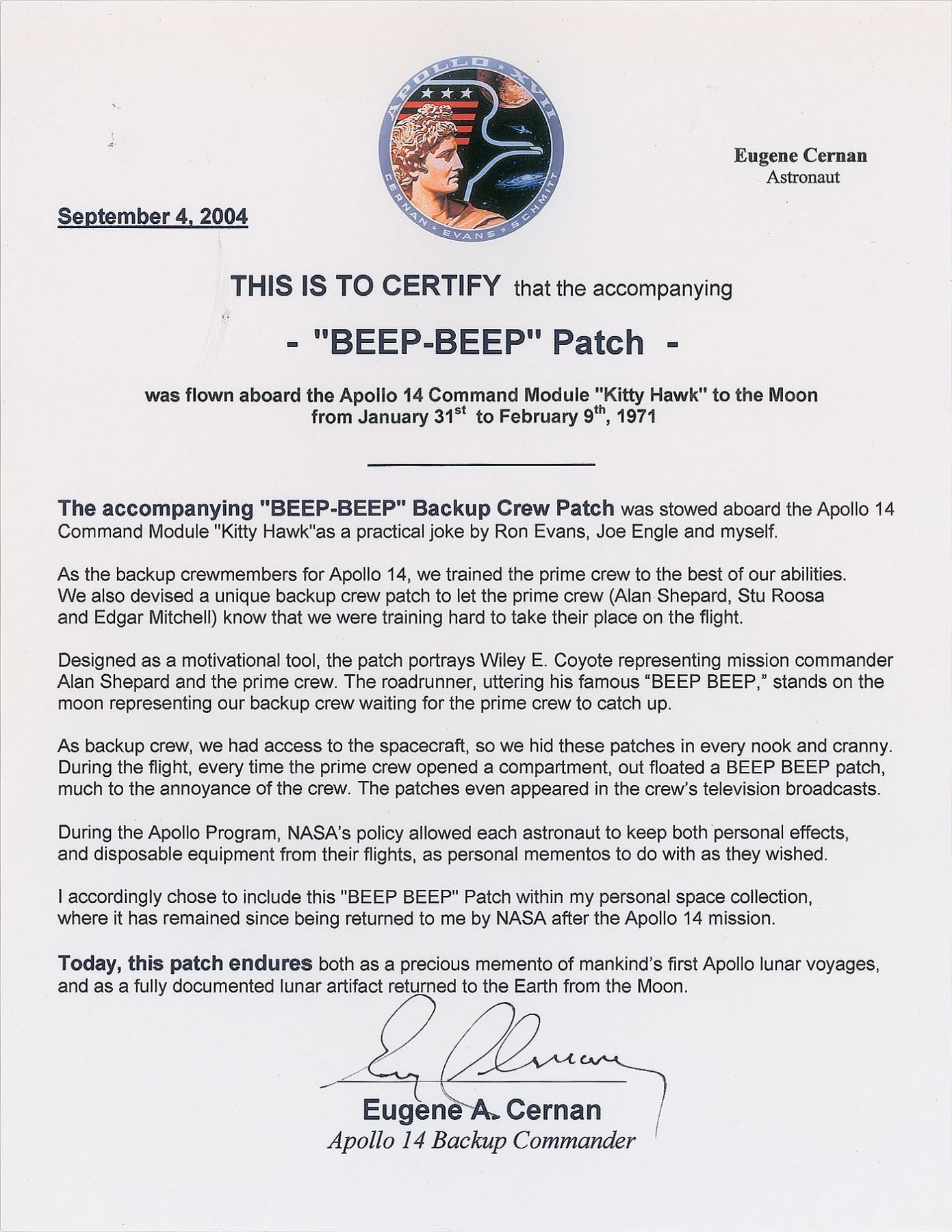 Accompanied by a certificate of authenticity from Novaspace signed by Cernan, as well as a detailed signed letter of provenance from Cernan, in part: "This is to certify that the accompanying 'Beep-Beep' Patch was flown aboard the Apollo 14 Command Module 'Kitty Hawk' to the Moon from January 31st to February 9th, 1971. The accompanying 'Beep-Beep' Backup Crew Patch was stowed aboard the Apollo 14 Command Module 'Kitty Hawk' as a practical joke by Ron Evans, Joe Engle and myself. As the backup crewmembers for Apollo 14, we trained the prime crew to the best of our abilities. We also devised a unique backup crew patch to let the prime crew (Alan Shepard, Stu Roosa and Edgar Mitchell) know that we were training hard to take their place on the flight. Designed as a motivational tool, the patch portrays Wiley E. Coyote representing mission commander Alan Shepard and the prime crew. The roadrunner, uttering his famous 'Beep Beep,' stands on the moon representing our backup crew waiting for the prime crew to catch up. As backup crew, we had access to the spacecraft, so we hid these patches in every nook and cranny. During the flight, every time the prime crew opened a compartment, out floated a Beep Beep patch, much to the annoyance of the crew…Today, this patch endures both as a precious memento of mankind's first Apollo lunar voyages, and as a fully documented lunar artifact returned to the Earth from the moon." Also includes photographs of Gene Cernan and Edgar Mitchell holding the patch.