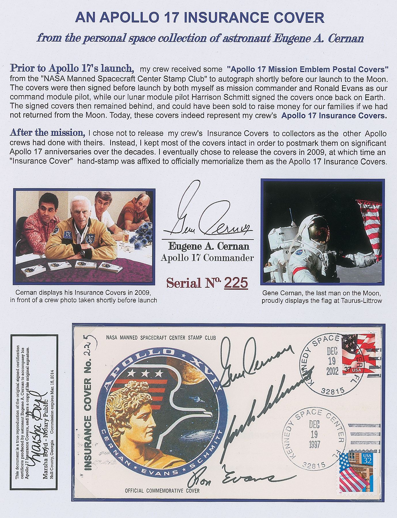 Sought-after Apollo 17 anniversary cover with a cachet of the mission insignia and text to top and bottom, "NASA Manned Spacecraft Center Stamp Club, Official Commemorative Cover," 6.5 x 3.5, signed in black felt tip by the entire crew: "Gene Cernan," "Jack Schmitt," and "Ron Evans." The front bears an identification stamp to left side, "Insurance Cover No. 225," and the reverse a provenance stamp from "The Eugene A. Cernan Space Collection." The cover also features postmarks dated December 19th in the years 1997, 2002, and 2007. In very fine condition. Accompanied by a notarized certificate of authenticity, serial numbered "225," and signed in black ink by Cernan, which features an image of him posing with four stacks of the insurance covers, and reads: "I chose not to release my crew's Insurance Covers to collectors as the other Apollo crews had done with theirs. Instead, I kept most of the covers intact in order to postmark them on significant Apollo 17 anniversaries over the decades. I eventually chose to release the covers in 2009, at which time an 'Insurance Cover' hand-stamp was affixed to officially memorialize them as the Apollo 17 Insurance Covers." After this presentation was released, Gene Cernan issued a clarification indicating he did not consider them to be official 'insurance covers.' As the signatures are undoubtedly authentic and originated from Cernan's collection, we are offering this as an 'insurance-like cover.'