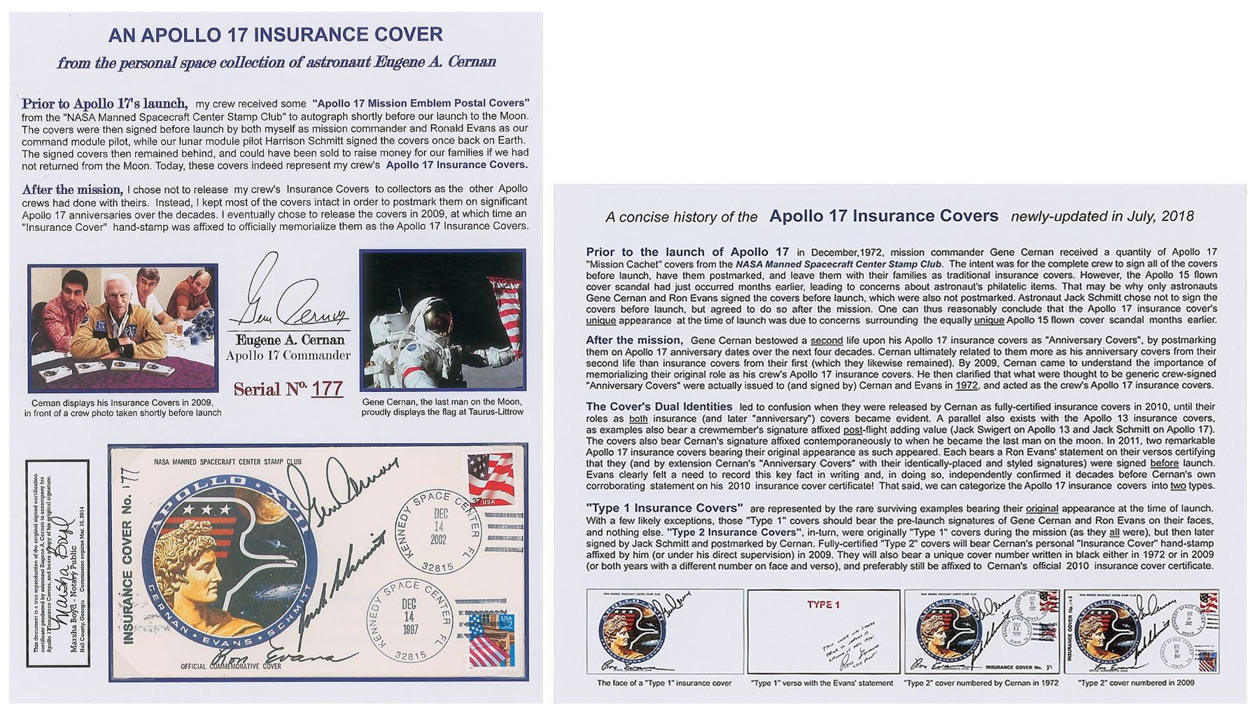 Sought-after Apollo 17 anniversary cover with a cachet of the mission insignia and text to top and bottom, "NASA Manned Spacecraft Center Stamp Club, Official Commemorative Cover," 6.5 x 3.5, signed in black felt tip by the entire crew: "Gene Cernan," "Jack Schmitt," and "Ron Evans." The front bears an identification stamp to left side, "Insurance Cover No. 177," and the reverse a provenance stamp from "The Eugene A. Cernan Space Collection." The cover also features postmarks dated December 19th in the years 1997, 2002, and 2007. In very fine condition. Accompanied by a notarized certificate of authenticity, serial numbered "177," and signed in black ink by Cernan, which features an image of him posing with four stacks of the insurance covers, and reads: "I chose not to release my crew's Insurance Covers to collectors as the other Apollo crews had done with theirs. Instead, I kept most of the covers intact in order to postmark them on significant Apollo 17 anniversaries over the decades. I eventually chose to release the covers in 2009, at which time an 'Insurance Cover' hand-stamp was affixed to officially memorialize them as the Apollo 17 Insurance Covers." After this presentation was released, Gene Cernan issued a clarification indicating he did not consider them to be official 'insurance covers.' As the signatures are undoubtedly authentic and originated from Cernan's collection, we are offering this as an 'insurance-like cover.'