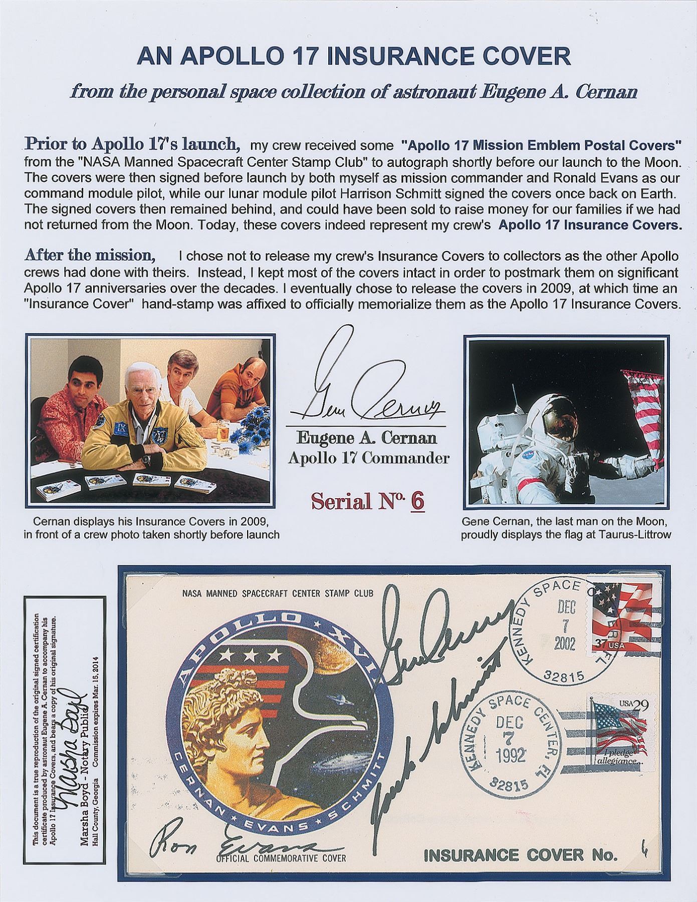 Rare Apollo 17 insurance 'type' cover with a cachet of the mission insignia and text to top and bottom, "NASA Manned Spacecraft Center Stamp Club, Official Commemorative Cover," 6.5 x 3.5, signed in black felt tip by the entire crew: "Gene Cernan," "Jack Schmitt," and "Ron Evans." The front bears an indentation stamp to lower right, "Insurance Cover No. 6," and the reverse a provenance stamp from "The Eugene A. Cernan Space Collection." The cover also features postmarks dated December 7th in the years 1992, 2002, and 2007. In fine condition. Accompanied by a notarized certificate of authenticity, serial numbered "6," and signed in black ink by Cernan, which features an image of him posing with four stacks of the insurance covers, and reads: "I chose not to release my crew's Insurance Covers to collectors as the other Apollo crews had done with theirs. Instead, I kept most of the covers intact in order to postmark them on significant Apollo 17 anniversaries over the decades. I eventually chose to release the covers in 2009, at which time an 'Insurance Cover' hand-stamp was affixed to officially memorialize them as the Apollo 17 Insurance Covers." Very few covers for the Apollo 17 mission exist as the crew wanted to avoid any philatelic controversy spurred by the Apollo 15 Sieger incident. Additionally, fully signed examples are even scarcer—Cernan and CMP Evans both signed a total of 500 insurance covers while in preflight quarantine, a period LMP Harrison Schmitt initially opted not to sign, and the chief reason why these covers weren't postmarked on the date of launch; it was only after the mission did Schmitt elect to add his name to these covers. Safely contained by the mission commander for over 35 years, this is a highly sought-after and fully signed cover that represents man's last lunar excursion.
