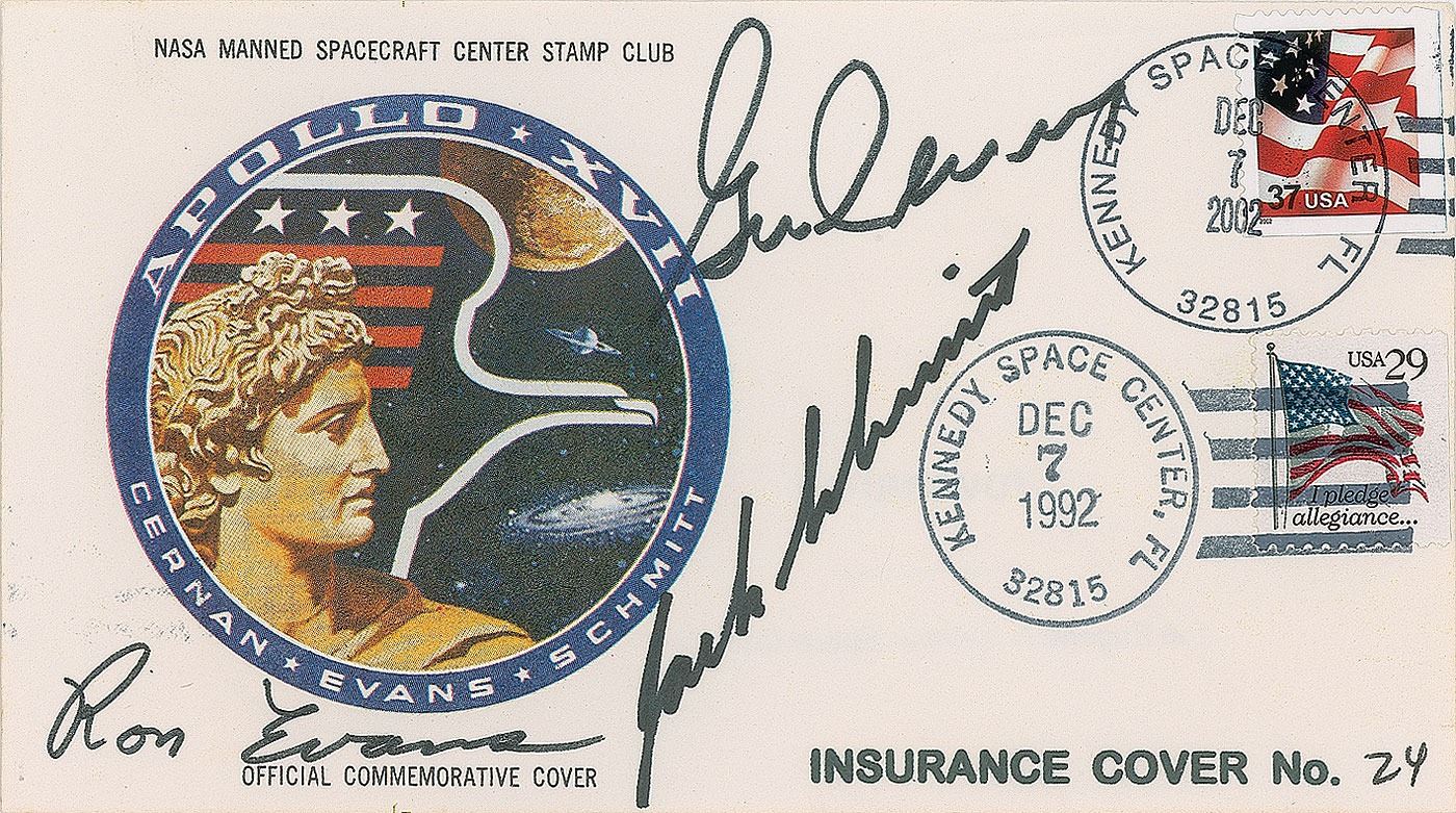 Sought-after Apollo 17 insurance 'type' cover with a cachet of the mission insignia and text to top and bottom, "NASA Manned Spacecraft Center Stamp Club, Official Commemorative Cover," 6.5 x 3.5, signed in black felt tip by the entire crew: "Gene Cernan," "Jack Schmitt," and "Ron Evans." The front bears an identification stamp to lower right, "Insurance Cover No. 24," and the reverse a provenance stamp from "The Eugene A. Cernan Space Collection." The cover also features postmarks dated December 7th in the years 1992, 2002, and 2007. In fine condition. Accompanied by a notarized certificate of authenticity, serial numbered "24," and signed in black ink by Cernan, which features an image of him posing with four stacks of the insurance covers, and reads: "I chose not to release my crew's Insurance Covers to collectors as the other Apollo crews had done with theirs. Instead, I kept most of the covers intact in order to postmark them on significant Apollo 17 anniversaries over the decades. I eventually chose to release the covers in 2009, at which time an 'Insurance Cover' hand-stamp was affixed to officially memorialize them as the Apollo 17 Insurance Covers." Very few covers for the Apollo 17 mission exist, as the crew wanted to avoid any philatelic controversy spurred by the Apollo 15 Sieger incident. Additionally, fully signed examples are even scarcer—Cernan and CMP Evans both signed a total of 500 insurance covers while in preflight quarantine, a period LMP Harrison Schmitt initially opted not to sign, and the chief reason why these covers weren't postmarked on the date of launch; it was only after the mission did Schmitt elect to add his name to these covers. Safely contained by the mission commander for over 35 years, this is a highly sought-after and fully signed cover that represents man's last lunar excursion.