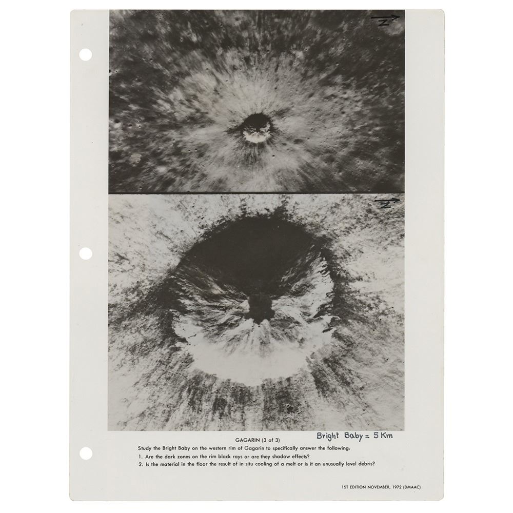 Gene Cernan’s flown page removed from the CSM Lunar Landmark Map book carried aboard the command module America during the Apollo 17 mission. The page measures 8 x 10.5 and is labeled in the lower right corner, "1st Edition November, 1972 (DMAAC)," with the reverse bearing an affixed Eugene A. Cernan Space Collection label, "The crew used this flown Apollo 17 CSM Lunar landmark Map to study the Moon from lunar orbit," signed in black ink by Cernan. The page features two overhead views of the large lunar impact crater Gagarin, with lower border bearing a handwritten notation, “Bright Baby = 5 Km,†and printed text: “Gagarin (3 of 3), Study the Bright Baby on the western rim of Gagarin to specifically answer the following: 1. Are the dark zones on the rim black rays or are they shadow effects? 2. Is the material in the floor the result of in situ cooling of a melt or is it an unusually level debris?†In fine condition.