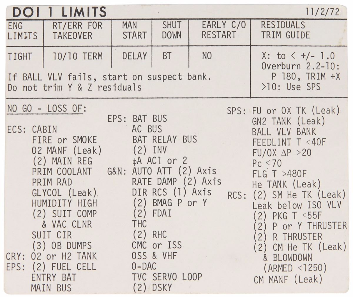Flown single-sided command module cue card from the Apollo 17 mission, 5.75 x 4.5, stamped on the reverse with flight certification, “Flown to lunar orbit aboard the Apollo 17 CM ‘America,’” and signed in blue ink, “Gene Cernan.” The cue card, dated November 2, 1972, is headed “DOI 1 Limits” and lists starting steps for orbit insertion as well as a list of reasons for possible system failure, including: “ECS: Cabin, Fire or Smoke, 02 Manf (Leak), (2) Main Reg, Prim Rad, Glycol (leak), Humidity High, (2) Suit Comp & Vac Clnr, Suit Cir, (3) OB Dumps, CRY: 02 or H2 Tank, EPS: (2) Fuel Cell, Entry Bat, Main Bus, Bat Bus, AC Bus, Bat Relay Bus, (2) Inv, A AC1 or 2.” In fine condition. One of two ways to approach the moon—the other being a direct lunar descent—a descent orbit insertion is attempted after executing a retrograde lunar orbit insertion (LOI) maneuver at or near periselene. After orbiting in the capture orbit for one or more orbits, the DOI is performed to lower periselene and start the descent to the lunar surface. An exceptional astronaut-certified piece from this historic final Apollo mission.