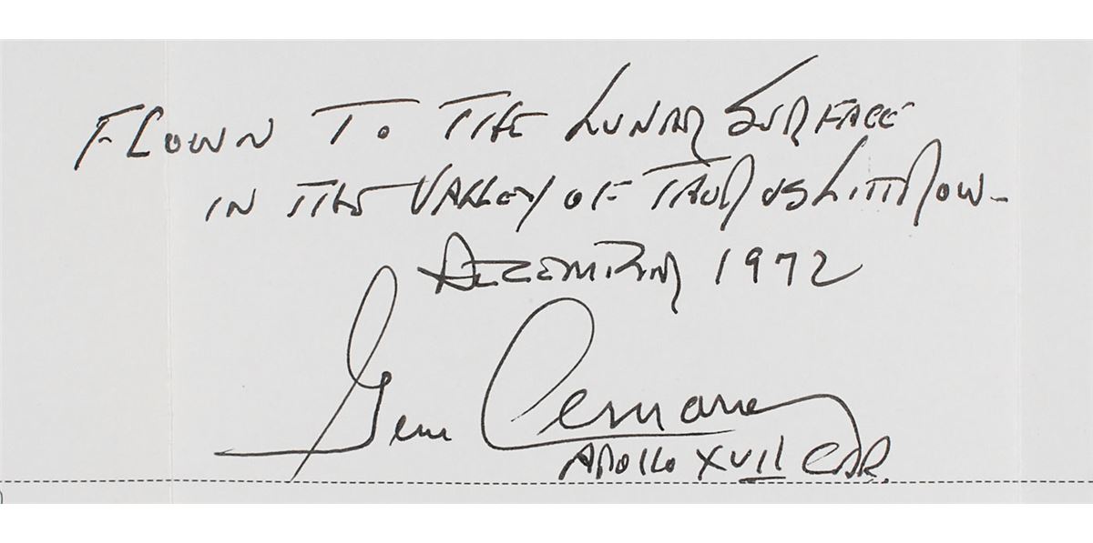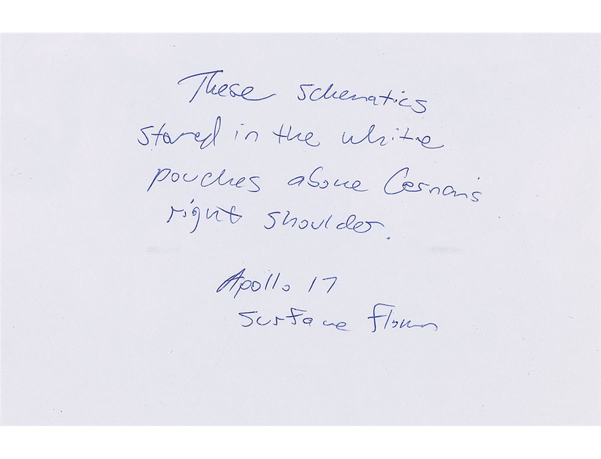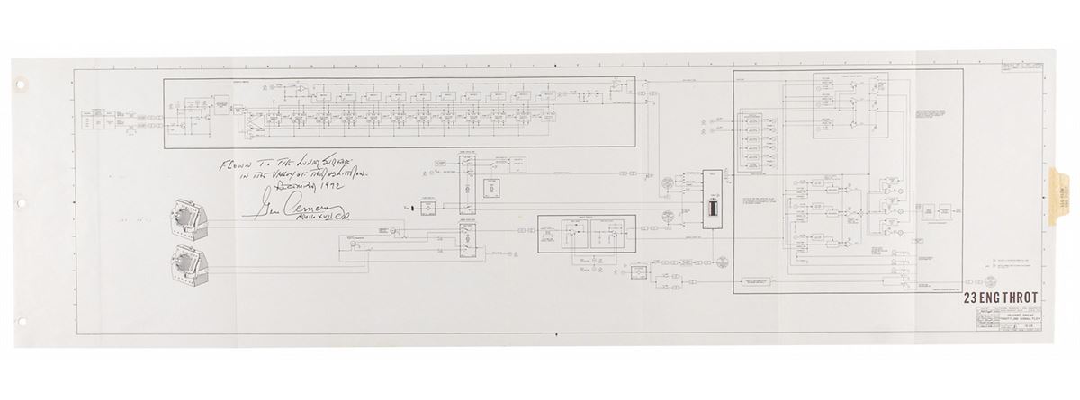Flown schematic for the descent engine throttling signal flow carried on the Apollo 17 mission, 10.5 x 37, signed and flight-certified in black felt tip, “Flown to the Lunar Surface in the Valley of Taurus Littrow, December 1972, Gene Cernan, Apollo XVII CMP.” The schematic diagrams the signal flow for the engine throttling system, following the signal from the thrust hand controls at the left-hand stations of the CDR and LMP. In fine condition, with vertical folds as issued. Accompanied by a signed letter of provenance from Cernan, in part: “This schematic drawing from Apollo 17 was flown to the surface of the moon aboard the Lunar Module Challenger…It was part of the LM Systems Data manual we carried along for troubleshooting and reference…The LM Systems Data manual is made up of 38 of these detailed schematic drawings.” Also accompanied by a photo of Cernan in the Lunar Module next to the pouch where the manual was stored.