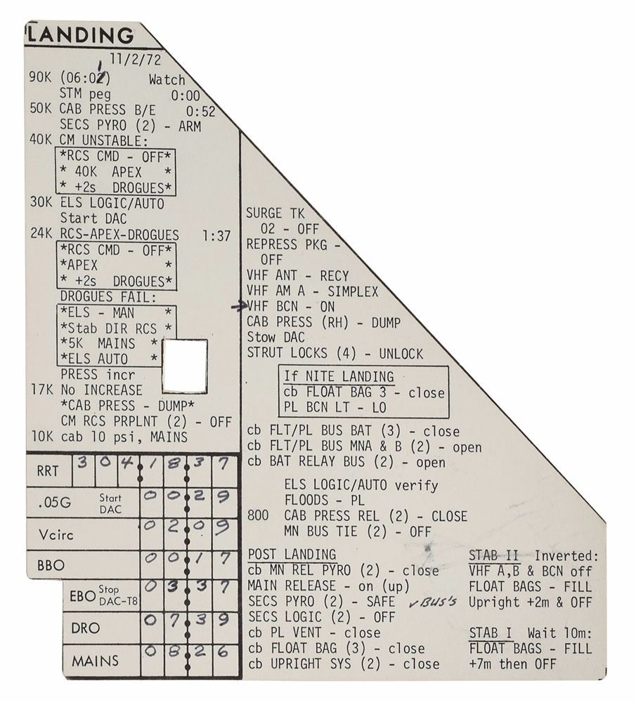 The third, headed “Landing,” is triangular, measures 6.5 x 7, and displays steps for both the CSM’s entry and post landing from 90K altitude through Stabilization 1, with in-flight notations in black ink by Lunar Module Pilot Harrison Schmitt, including: time of entry interface; time from interface to .05G event; time that communications blackout begins and ends; and time of drogue and main parachute deployment.