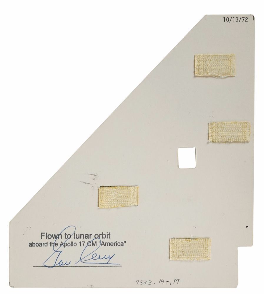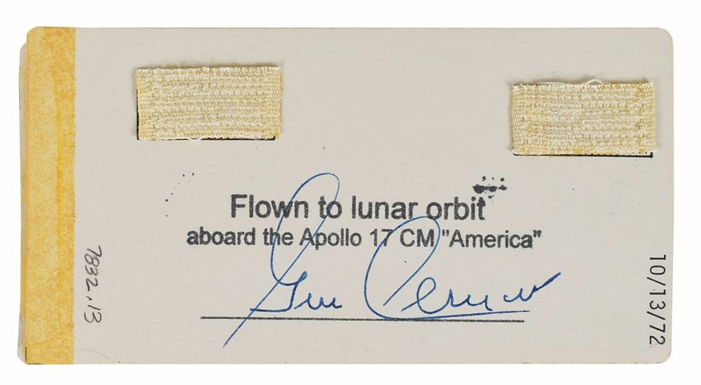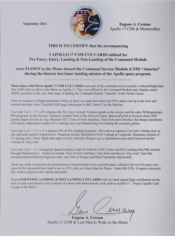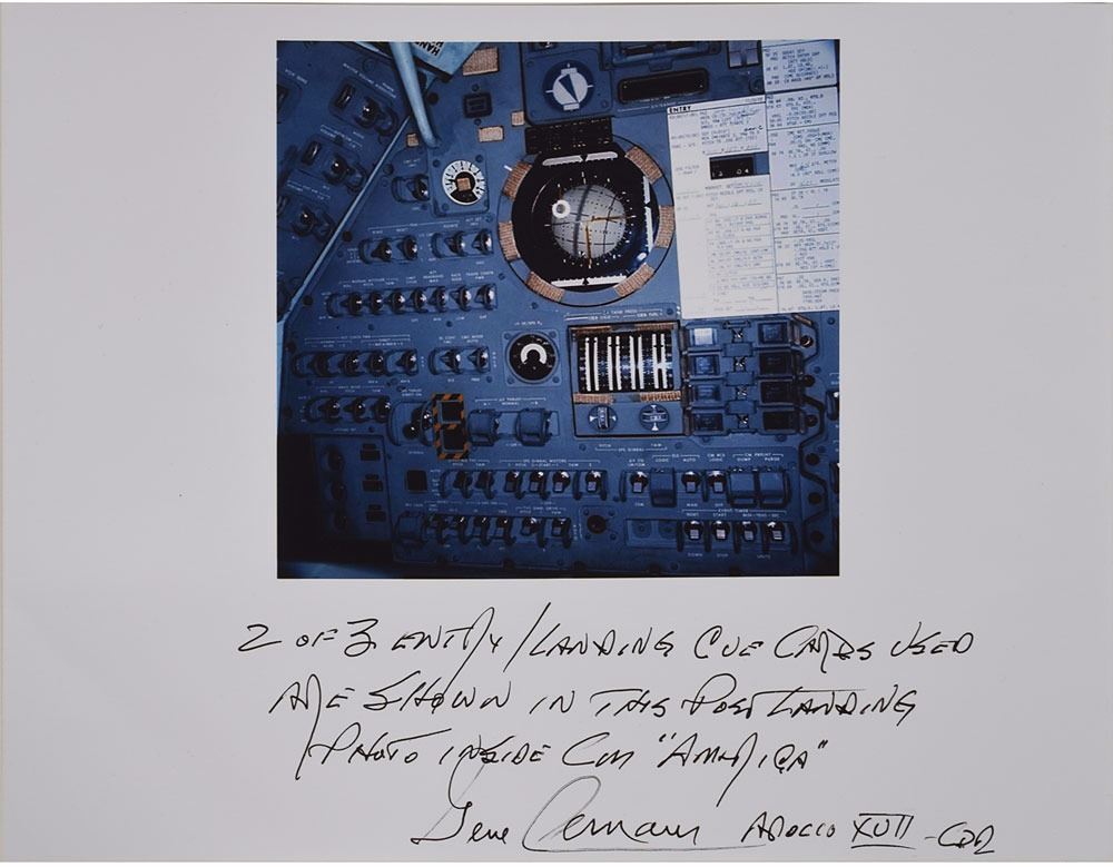 All cue cards bear affixed Velcro swatches. In overall fine condition, with expected wear from use. Accompanied by a photo of Cernan with the cards and a signed letter of provenance from Cernan, in part: “This is to certify that the accompanying 3 Apollo 17 CSM cue cards utilized for Pre-Entry, Entry, Landing, & Post-Landing of the Command Module were flown to the Moon aboard Command Service Module (CSM) ‘America’ during the historic last lunar landing mission of the Apollo space program. These lunar orbit flown Apollo 17 CSM cue cards were part of the command service module’s onboard flight data files (FDF) that we flew to the Moon on Apollo 17. They were affixed to the Command Module main display console (MDC) just prior to the very final stage of landing the Command Module ‘America’ in the Pacific Ocean. There is extensive in-flight notational writing on these cue cards that reflect the PAD values read up to the crew and entered into their Entry Checklist PAD page subsequent to MCC burn #7 on the final day…These cue cards remained in my possession as a treasured part of my personal space collection for 40 years.” Also includes a color satin-finish 10 x 8 photo of the Command Module’s console in which two of these cards can be seen, signed in black felt tip by Cernan, “2 of 3 entry/landing cue cards used are shown in this post landing photo inside CM ‘America,’ Gene Cernan, Apollo XVII CDR.” On December 19, 1972, following a successful final journey to the moon, the CM 'America' reentered Earth's atmosphere and landed in the Pacific Ocean at 2:25 PM, four miles from the recovery ship, USS Ticonderoga. A remarkable set of mission-used cue cards from the collection of the last man on the moon.