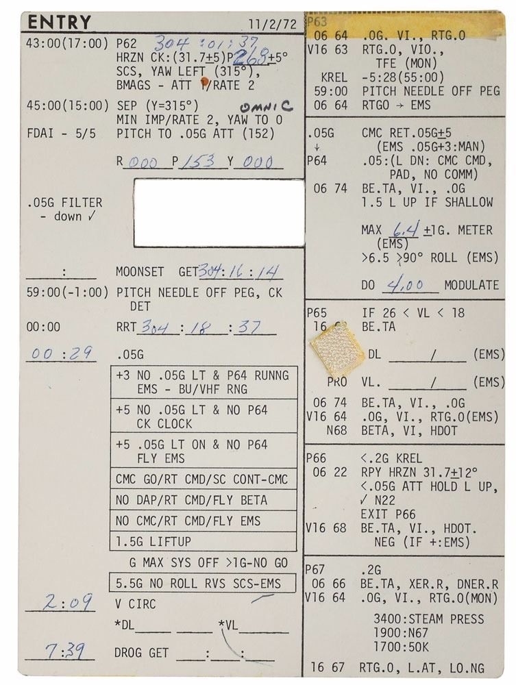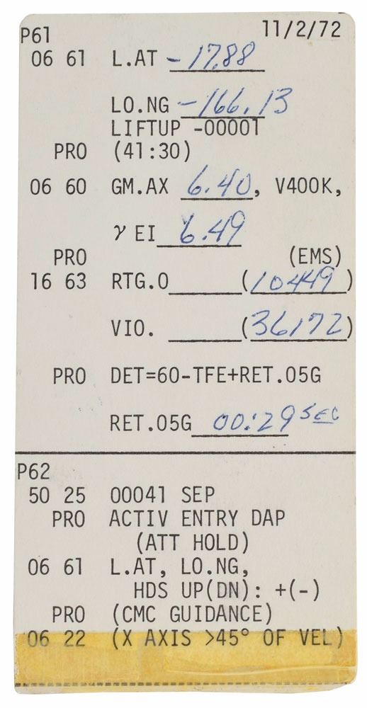The second, which was taped to the first during entry, is single-sided, measures 2.5 x 4.75, and displays the P61 and P62 ending programs, with in-flight notations in blue ink by Cernan, including: splashdown point latitude and longitude; maximum number of Gs during entry; entry flight path angle at entry interface; range to go to splashdown point; and predicted inertial velocity at .05G event.