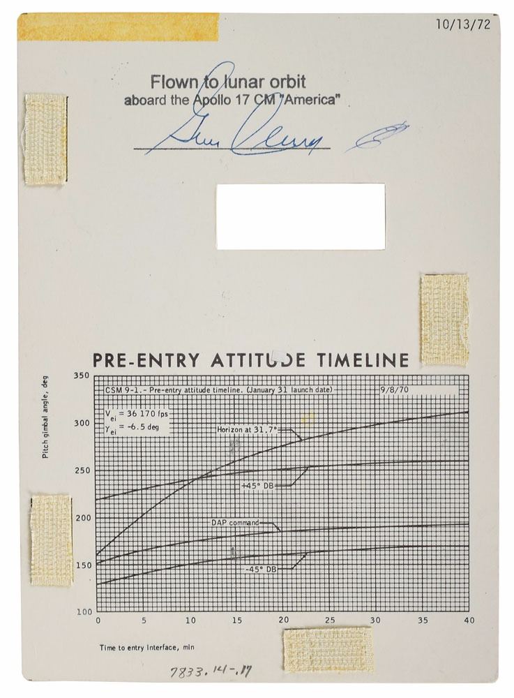 Remarkable set of three Command Module cue cards flown and used on the return of Apollo 17, the final flight of the golden age of the Apollo lunar landings. Each is stamped “Flown to lunar orbit aboard the Apollo 17 CM ‘America,’” and signed in blue ink by Apollo 17 Commander Gene Cernan. The first is double-sided, measures 5.75 x 8, and displays a “Pre-Entry Attitude Timeline” on the reverse and “Entry” programs on the front, with extensive in-flight notations in blue ink by Cernan, including: time of the horizon check; spacecraft pitch at horizon check; IMU gimbal angles for trim at .05G; moonset GET; time of entry interface; time from entry interface that drogue parachutes will deploy; maximum number of Gs during entry; and planned drag level during the constant G phase.