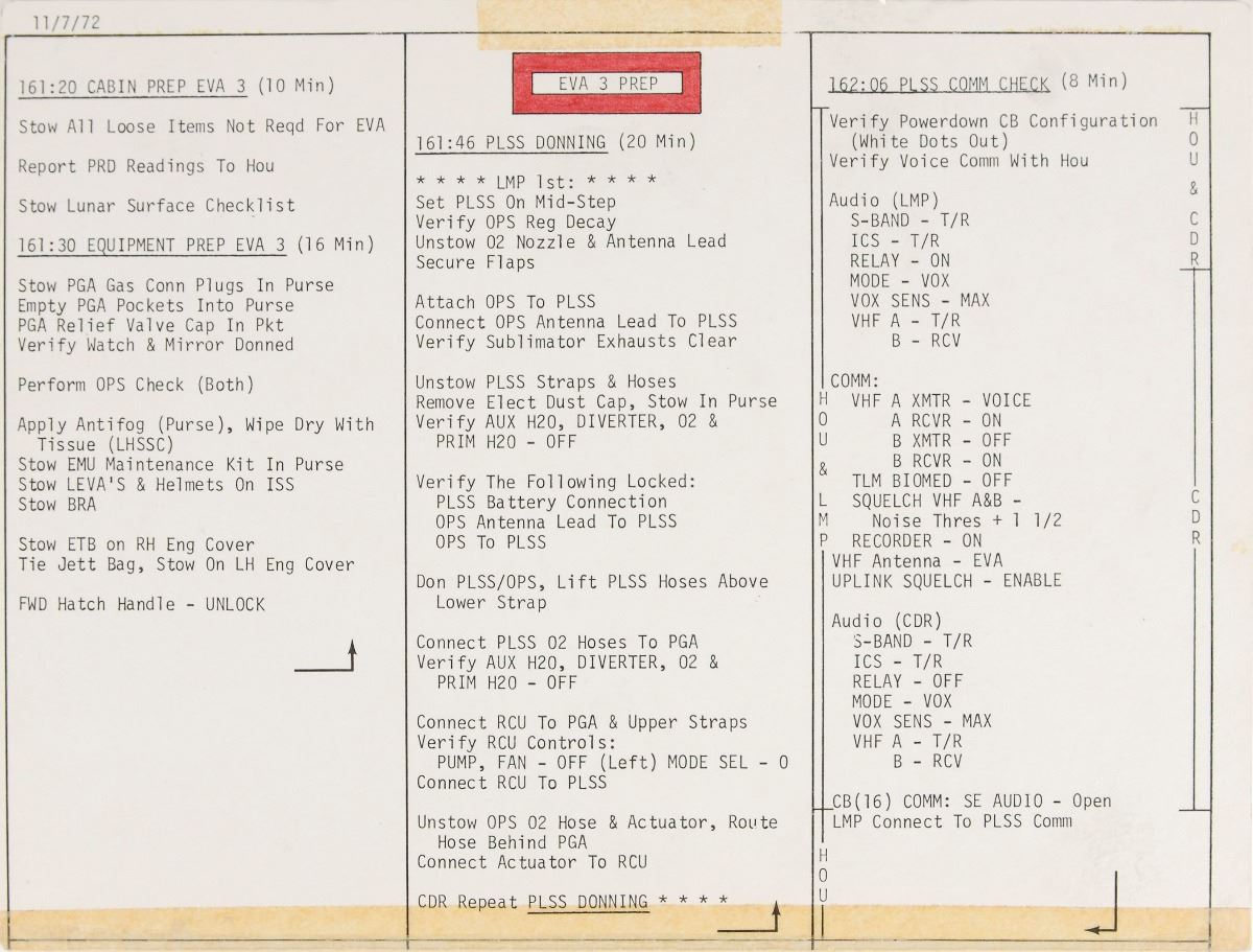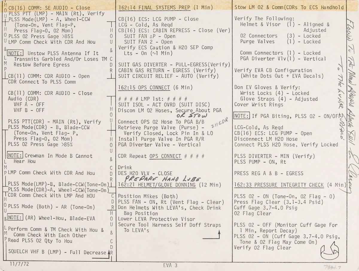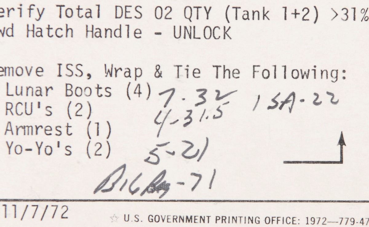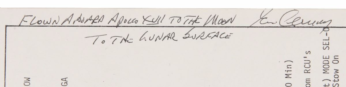 After successfully undocking from Ron Evans and the command module America, the lunar module Challenger crew of commander Cernan and LMP Schmitt landed within the lunar valley of Taurus–Littrow on December 11, 1972. The crew performed one EVA (extravehicular activity) on each of their three days on the lunar surface, and, after repairing the broken front fender of the LRV, proceeded to smash several Apollo records—lunar stay (74 hours, 59 minutes), total EVA duration (22 hours), and lunar rock and soil collection (253 lbs). The completion of the third and final EVA, which brought the crew to the base of the North Massif, the Sculptured Hills, and the Van Serg crater, also achieved a program record 21.75 total moon miles aboard the lunar rover, with Cernan recording an unofficial lunar land-speed record of 11.2 mph. An incredible pair of lunar flown EVA cue cards, direct from the personal safekeeping of the last man to set foot on the moon.