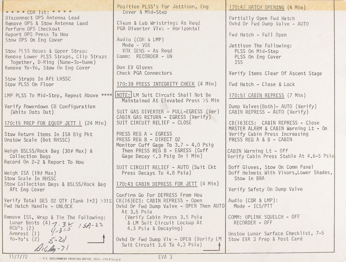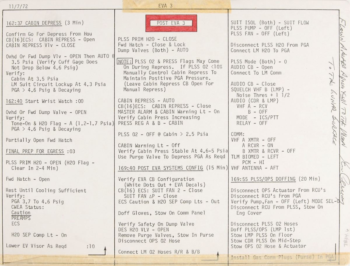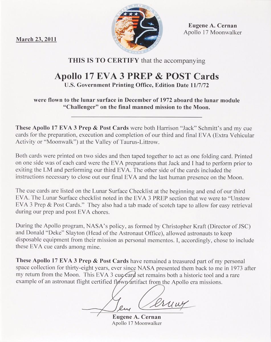 Gene Cernan’s pair of lunar flown double-sided EVA 3 Prep and Post cue cards carried aboard the lunar module Challenger during the Apollo 17 mission, both 10.5 x 8, and vertically signed and flight-certified along the right border in black ink by Cernan. The cue cards, dated November 7, 1972, feature the EVA preparations that Commander Cernan and Lunar Module Pilot Harrison Schmitt were required to perform, with the side headed “EVA 3 Prep” concerning procedures prior to exiting the LM and performing the mission’s third EVA, and the opposite side, headed “Post EVA 3,” detailing the instructions necessary to conclude the EVA, thus ending the last human presence on the moon. One card bears felt tip notations on both sides, and both cards bear old tape remnants used to affix the pair as one foldable card. The cards list various timed steps related to EVA preparation, execution, and completion, including: “161:20 Cabin Prep EVA 3 (10 Min),” “161:30 Equipment Prep EVA 3 (16 Min),” “162:37 Cabin Depress (3 Min),” “Final Prep for Egress :03,” “170:47 Hatch Opening (4 Min),” and “170:51 Cabin Repress (7 Min),” with the final steps of the card related to this very item, “Unstow Lunar Surface Checklist, 7–5, Stow EVA 3 Prep & Post Card.” In overall fine condition. Accompanied by a photo of Cernan holding the cue cards, as well as a signed certificate of authenticity from Cernan, dated March 23, 2011, in part: “This is to certify that the accompanying Apollo 17 EVA 3 Prep & post Cards U.S. Government Printing Office, Edition date 11/7/72, were flown to the lunar surface in December of 1972 aboard the lunar module ‘Challenger’ on the final manned mission to the Moon…[They] have remained a treasured part of my personal space collection for thirty-eight years, ever since NASA presented them back to me in 1973 after my return from the Moon.”