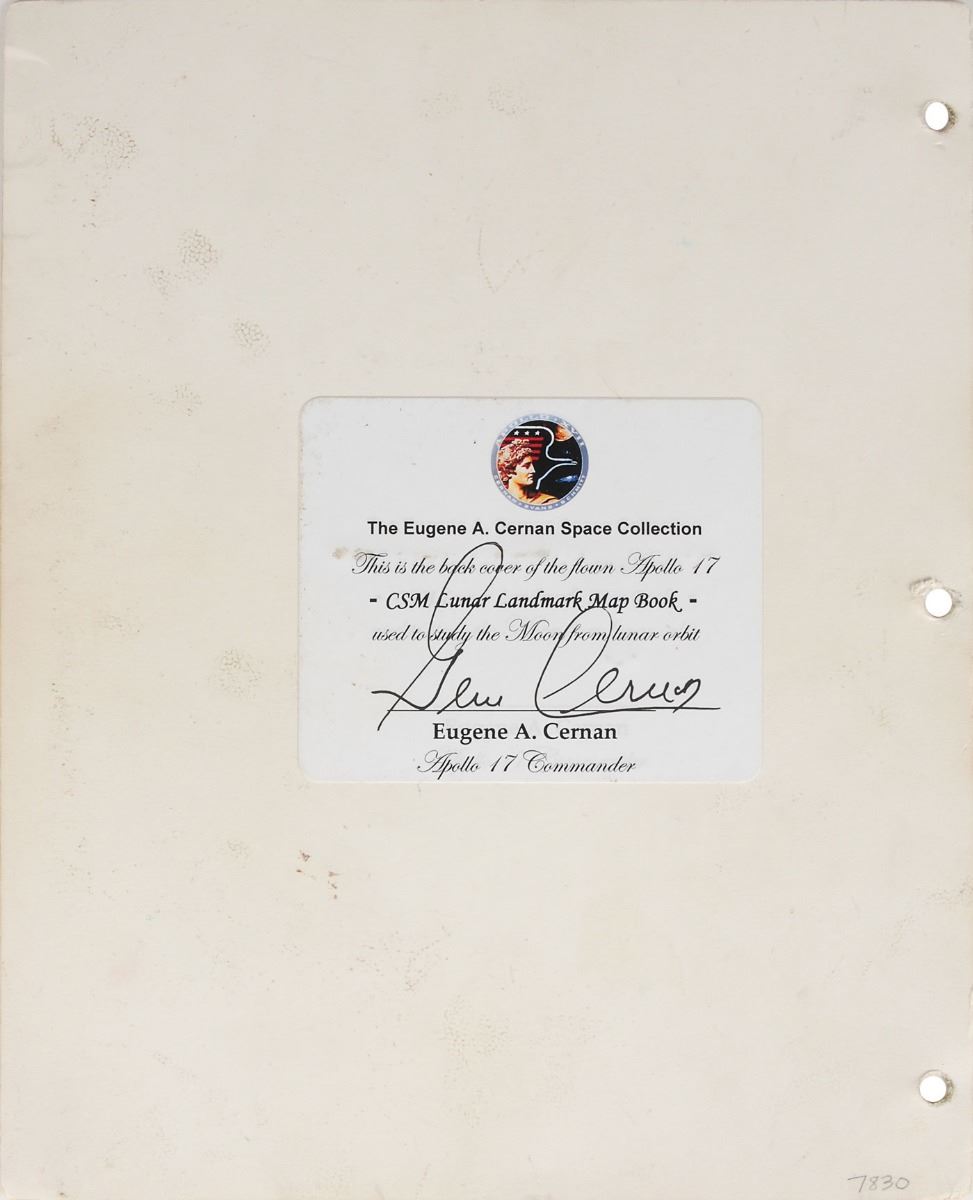Lunar orbit flown front and back covers to the CSM Lunar Landmark Maps manual carried aboard the Apollo 17 command module America, both 8.5 x 10.5, with the front cover reading, “Apollo 17, CSM Lunar Landmark Maps, Part No. SKB32100123–322, S/N 1001,” and bearing a Eugene A. Cernan Space Collection provenance stamp. Both covers are affixed with Eugene A. Cernan Space Collection labels signed in black felt tip by Cernan; the labels read, in part: “This is the…cover of the flown Apollo 17—CSM Lunar Landmark Map Book—used to study the Moon from lunar orbit.” In overall very good to fine condition. Deriving from the personal safekeeping of the Apollo 17 commander, this is an appealing tandem of flown items related to the scanning and study of the lunar topography during the final Apollo mission.