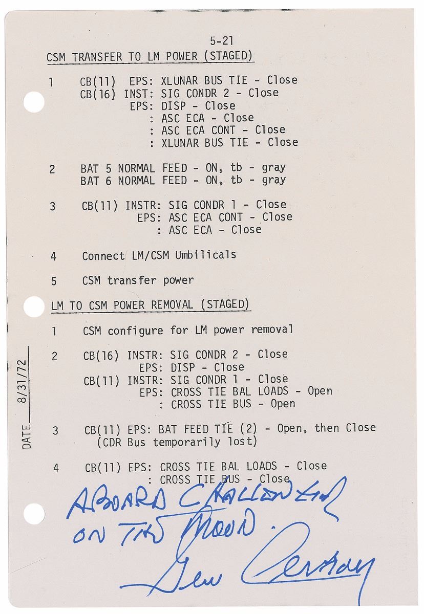 Fantastic flown single-sided checklist page carried to the lunar surface on the Apollo 17 mission, 5.5 x 8, signed and flight-certified at the bottom in blue felt tip, “Aboard Challenger on the Moon, Gene Cernan.” The page is headed “5-21” and provides steps for the “CSM Transfer to LM Power (Staged)” and “LM to CSM Power Removal (Staged) processes.” Reverse is labeled as intentionally left blank. In fine condition. Accompanied by a data CD and certificate of authenticity attesting to the page’s provenance. All versions of the Apollo spacecraft used the Command Service Module to transfer power to the Lunar Module in preparation for lunar landing, a process that was tested successfully during Apollo 10. However, after the Apollo 13 malfunction the design was modified to also allow the LM to initiate this transfer. This page is exceedingly desirable as it represents a process critical to preparing the LM for man’s last descent to the lunar surface and is also signed by the last man to do so.