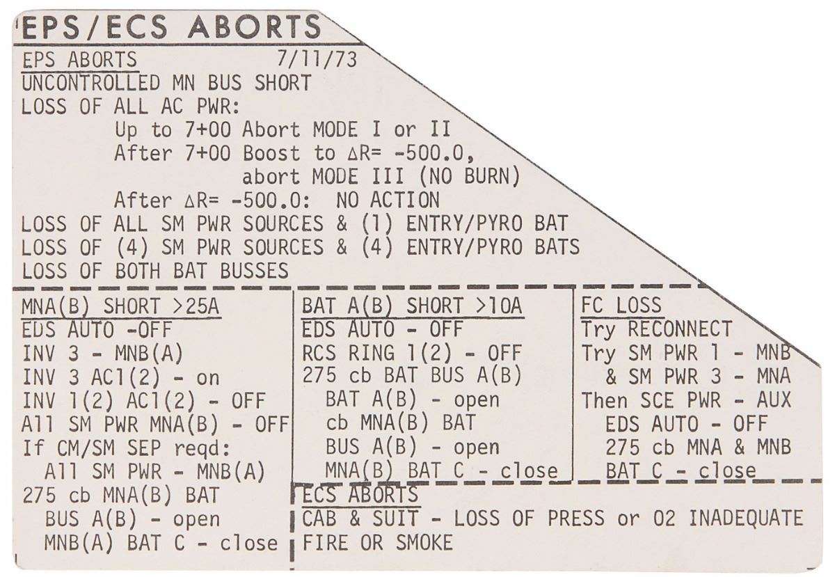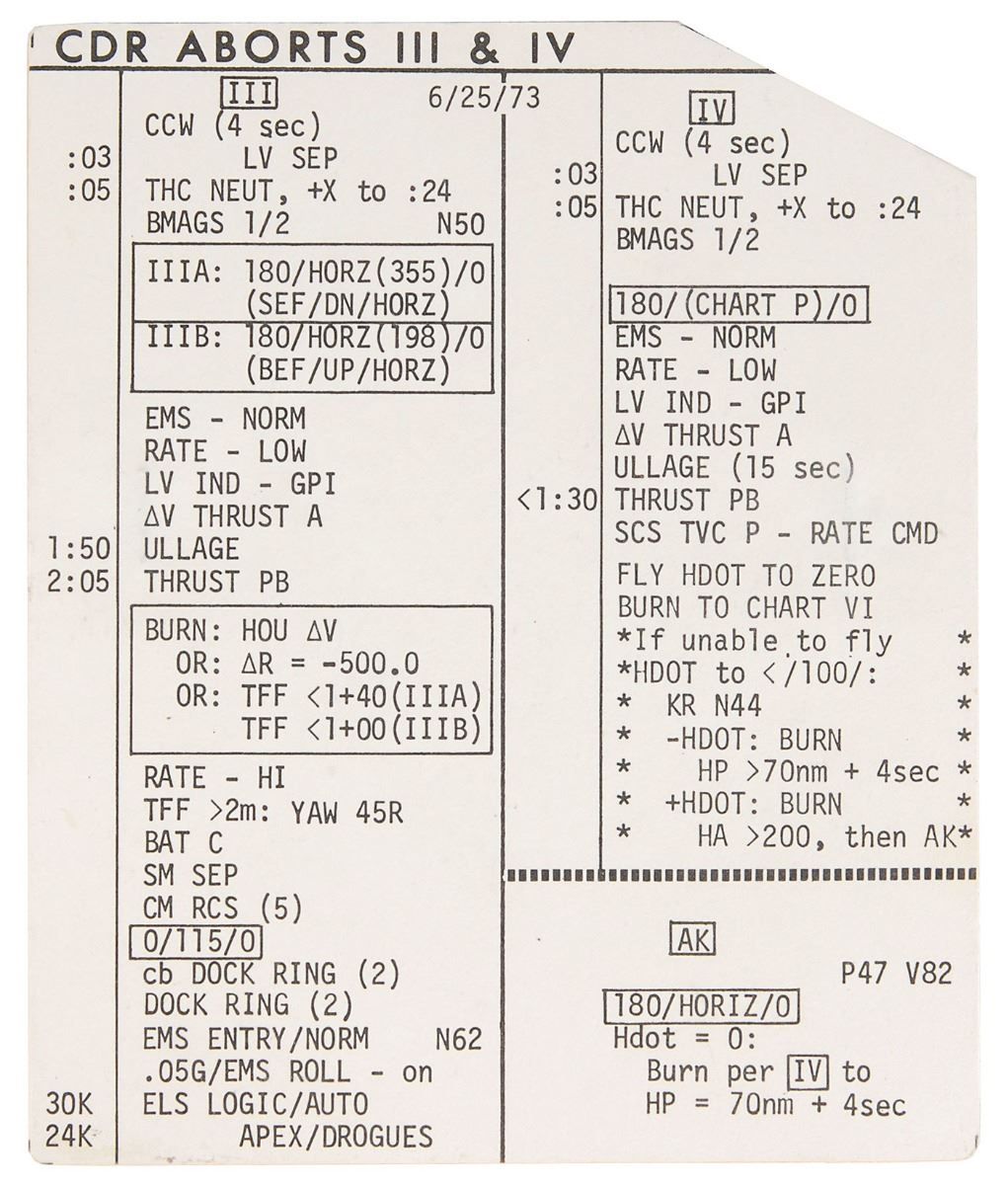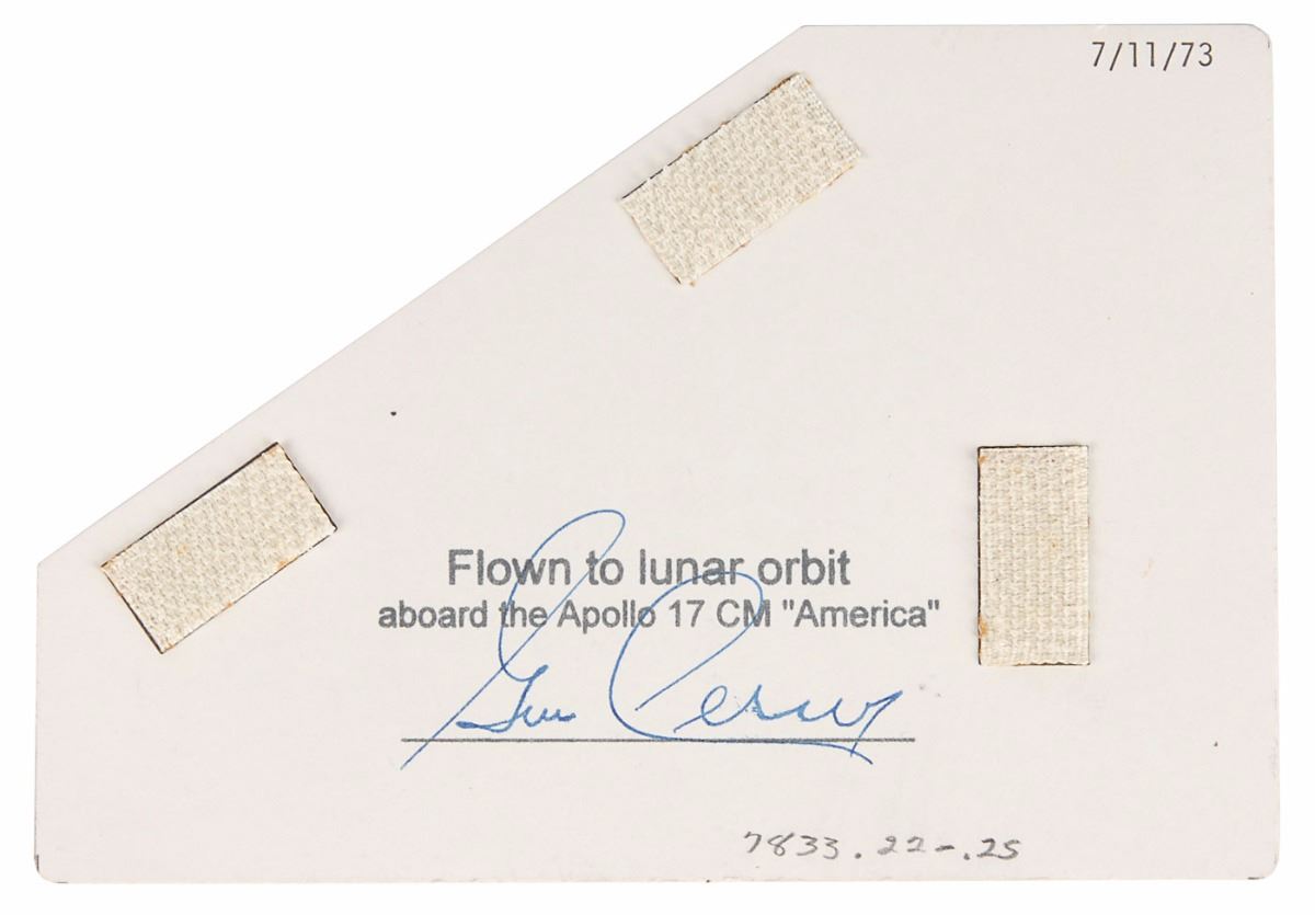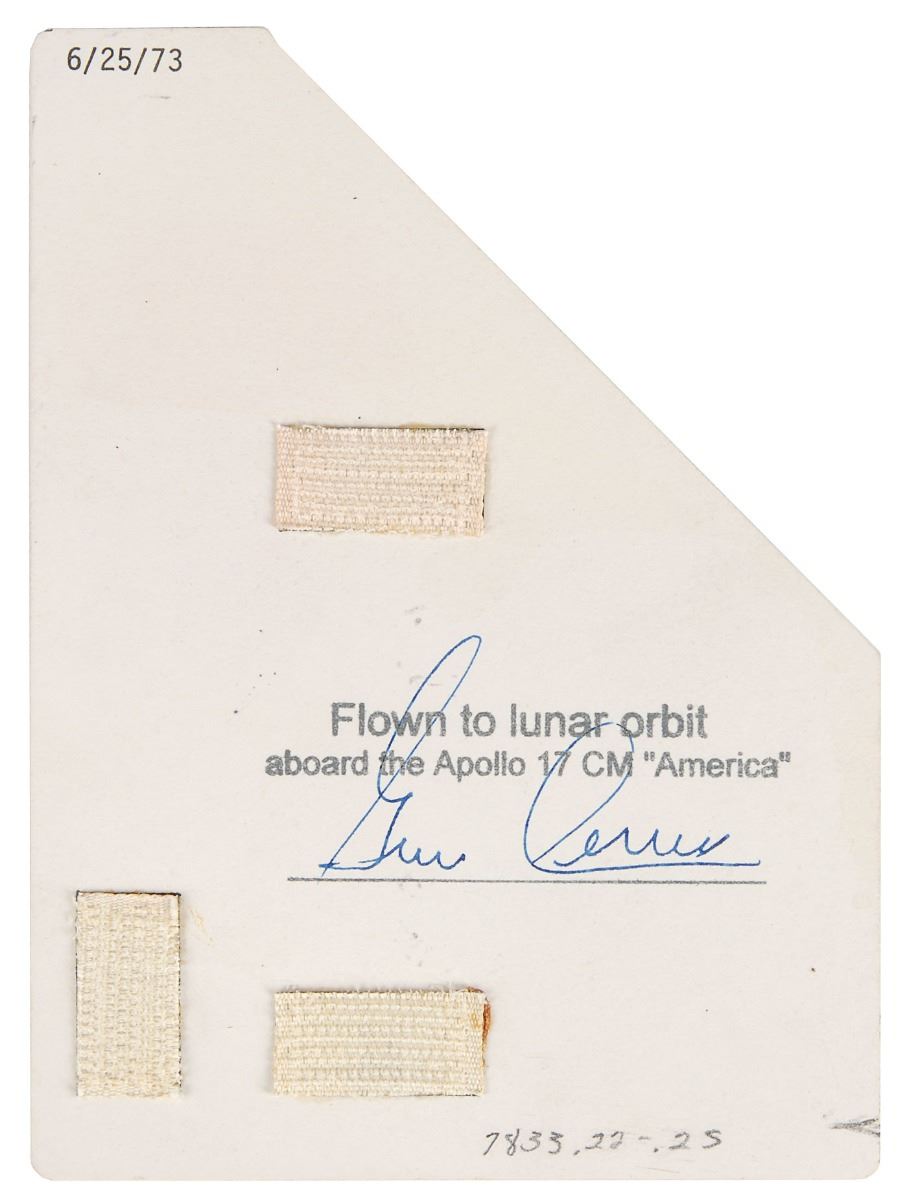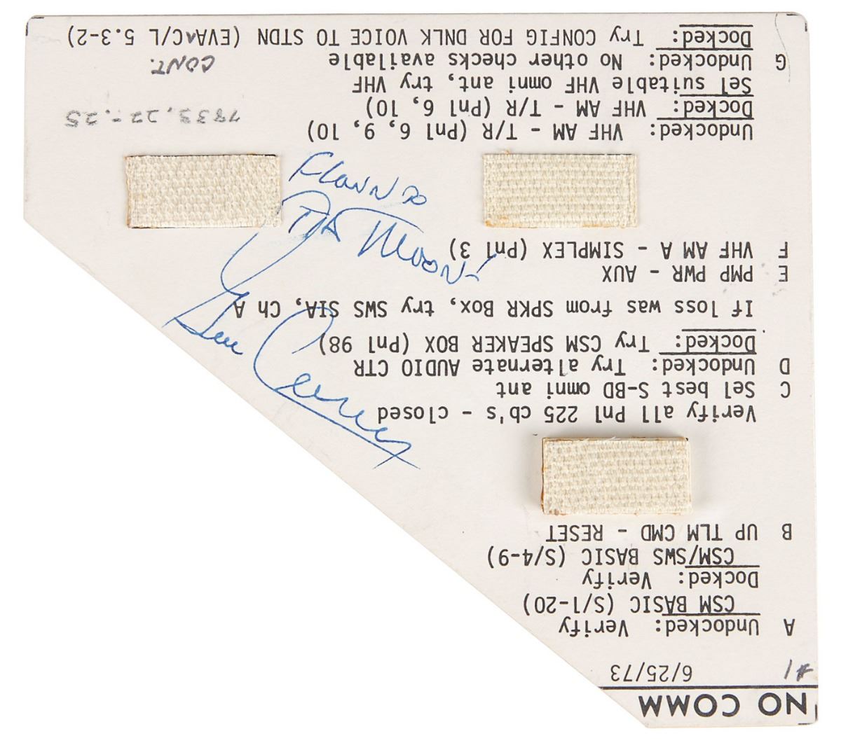 Highly sought-after set of four flown Command Module cue cards from the Apollo 17 mission, ranging in size from 4.75 x 5.75 to 5.75 x 4, with three single-sided cards stamped on the reverse with flight certification, “Flown to lunar orbit aboard the Apollo 17 CM ‘America,’” and signed in blue ink, “Gene Cernan,” and one double-sided card signed and flight certified in blue ink, “Flown to the moon! Gene Cernan.” The front and back of the double-sided card, dated June 25, 1973, is headed “Pwr Users” and “No Comm,” and features codes for control and power systems and command service module docking and undocking procedures; the single-sided cards, dated June 25, 1973, and July 11, 1973, are headed “Cdr Aborts III & IV,” “Launch Pwr Loss,” and “EPS/ECS Aborts,” and detail steps and measures for various CSM anomalies. In overall fine condition. Each of these cards provide critical information for CSM procedures and systems and bear affixed velcro swatches so that they could be easily accessible within the spacecraft. An excellent set of astronaut-certified, space-used pieces from man’s last trip to the moon.
