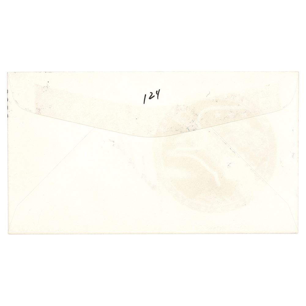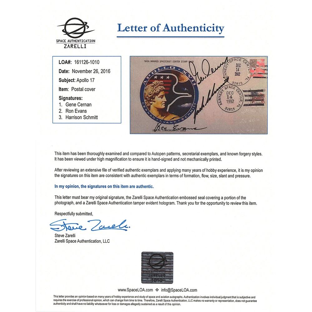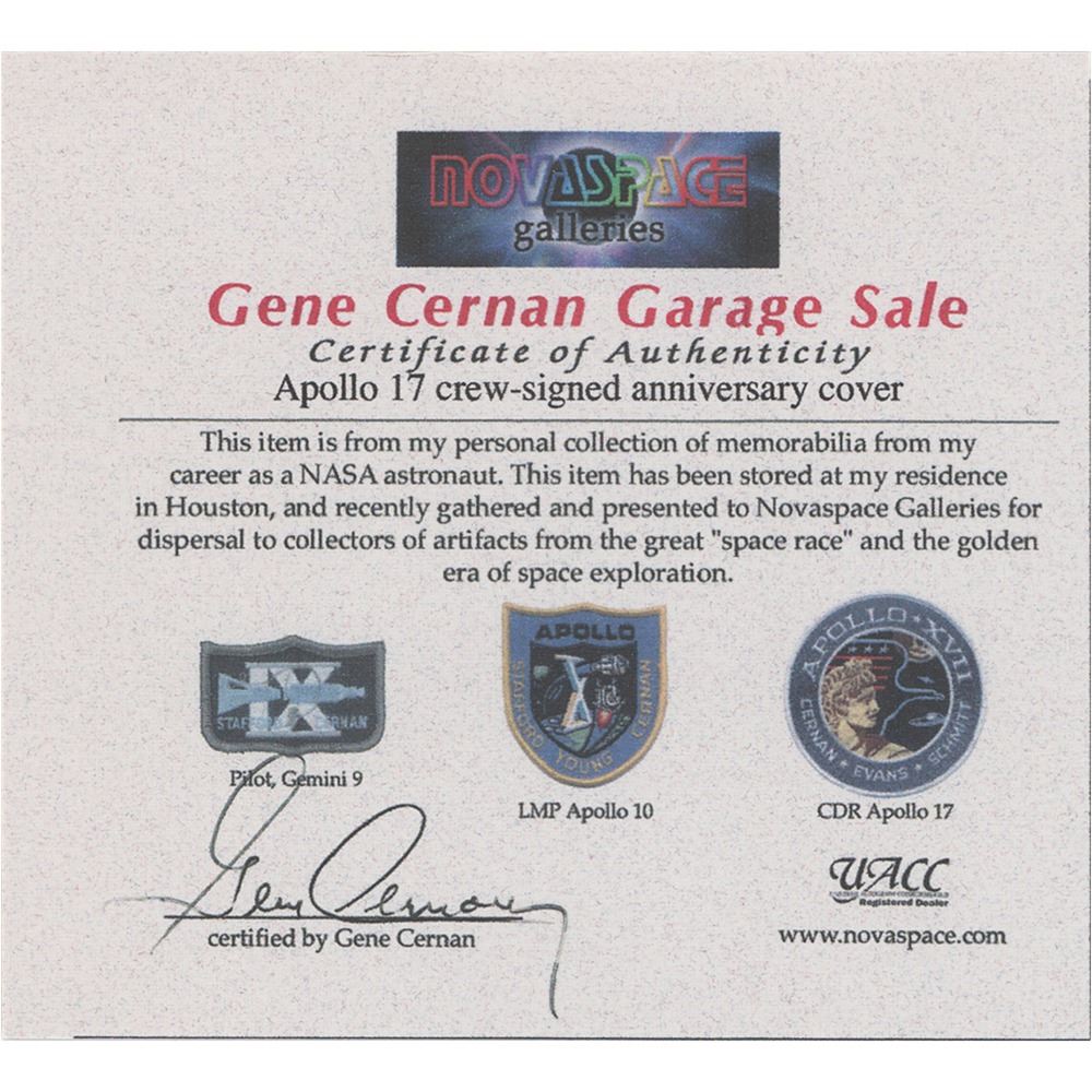 Apollo 17 anniversary cover with a cachet of the mission insignia and text to top and bottom, "NASA Manned Spacecraft Center Stamp Club, Official Commemorative Cover," 6.5 x 3.5, signed in black felt tip by the entire crew: "Gene Cernan," "Jack Schmitt," and "Ron Evans." The cover features postmarks dated December 14th in the years 1992 and 2002, and the reverse flap is numbered in pencil, “124.†In fine condition. Accompanied by a full letter of authenticity from Zarelli Space Authentication and by a certificate of authenticity from Novaspace and the ‘Gene Cernan Garage Sale.’