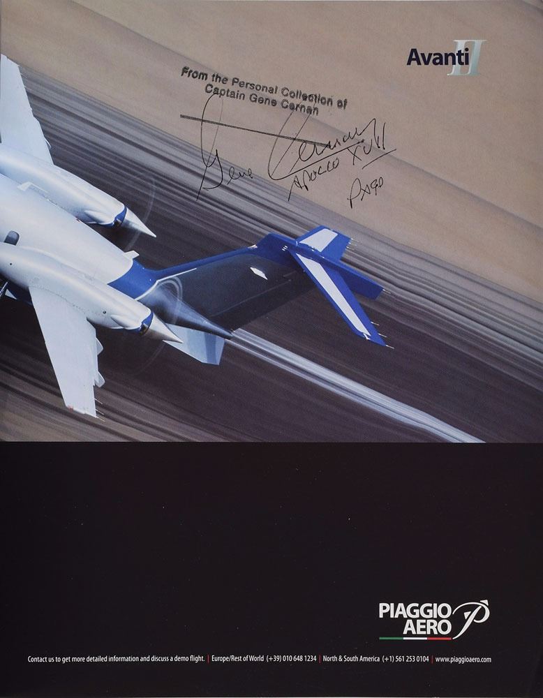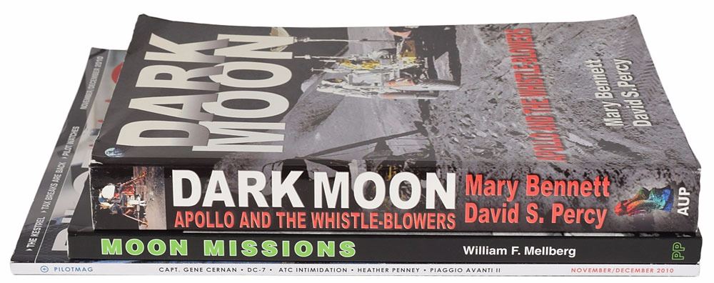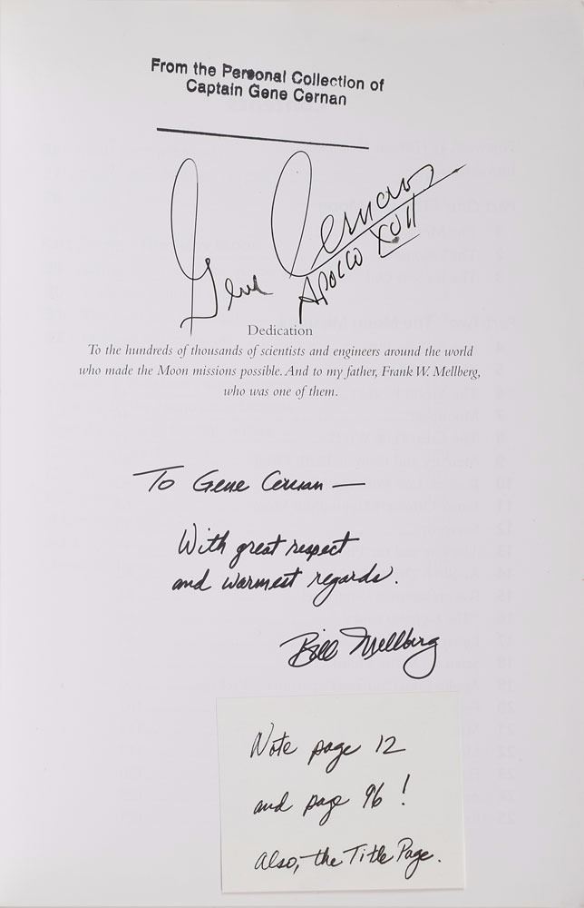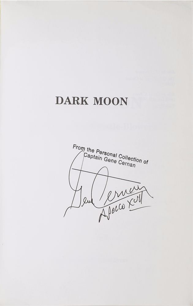 Group of two books and one magazine from the personal collection of moonwalker Gene Cernan, each signed on an opening page in ink below his ownership stamp, “Gene Cernan, Apollo XVII.” The book titles include: Moon Missions: Mankind’s first voyages to another world, and Dark Moon: Apollo and the Whistle Blowers. The magazine is a copy of Pilotmag from November/December 2010, which depicts Cernan on the front cover. The Moon Mission book is also signed and inscribed by the author William F. Melberg. In overall fine condition, with mild scuffing and creasing to covers. Originating from the Astronaut Scholarship Foundation, a portion of the proceeds for the sale of these items will be donated to the ASF.