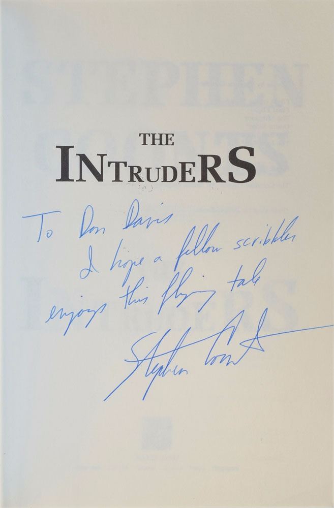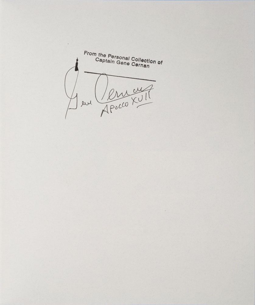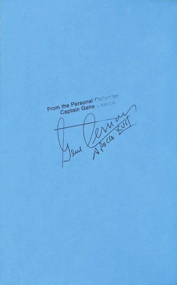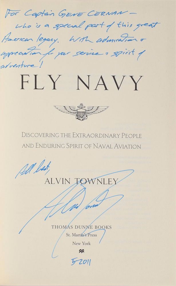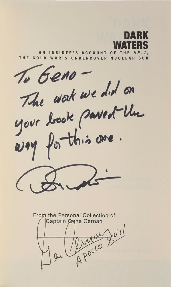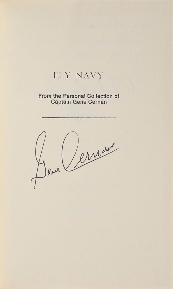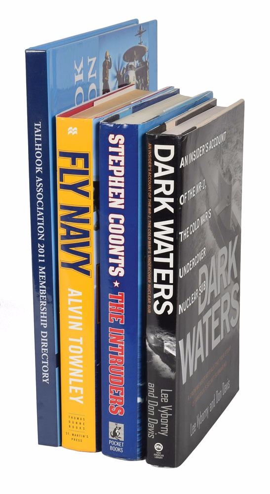 Group of four books from the personal collection of moonwalker Gene Cernan, each signed on an opening page or the front pastedown in ink below his ownership stamp, “Gene Cernan, Apollo XVII,” with three books signed and inscribed by the respective author, including: Alvin Townley, Stephen Coonts, and Don Davis. Titles include: Fly Navy; The Intruders; Dark Waters (which bears an affixed Post–It annotated by Cernan, “My Co-Author of ‘Last Man on the Moon!’”); and a 2011 Membership Directory for the Tailhook Association. In overall fine condition. Originating from the Astronaut Scholarship Foundation, a portion of the proceeds for the sale of these items will be donated to the ASF.