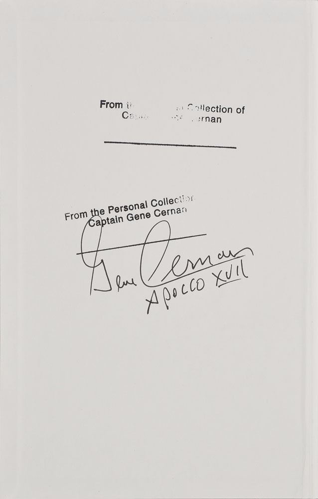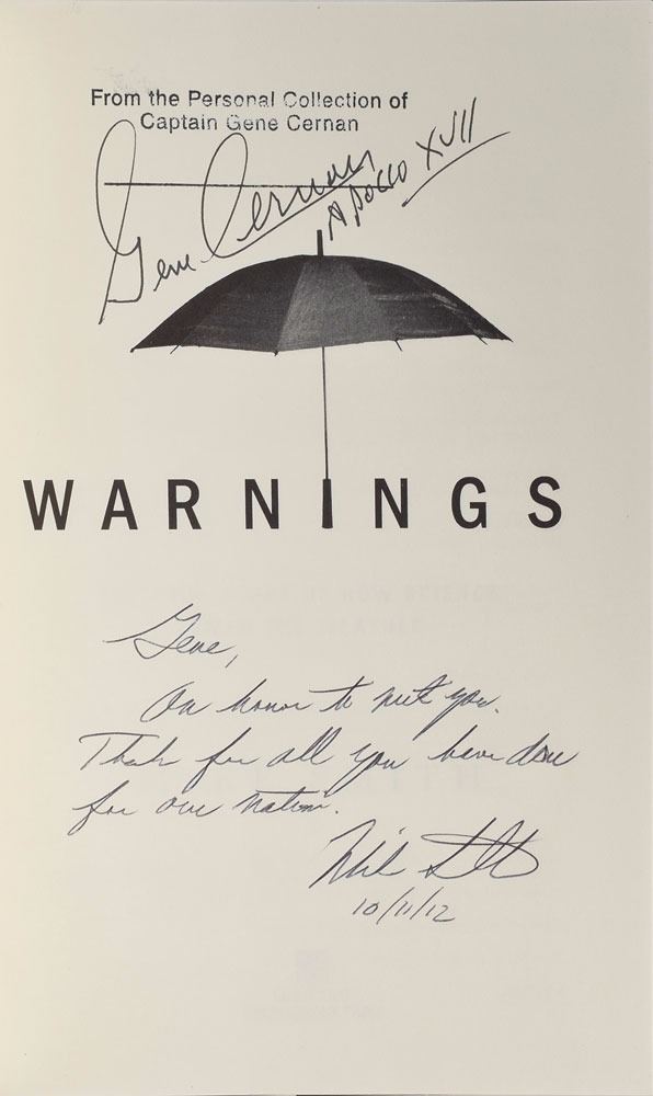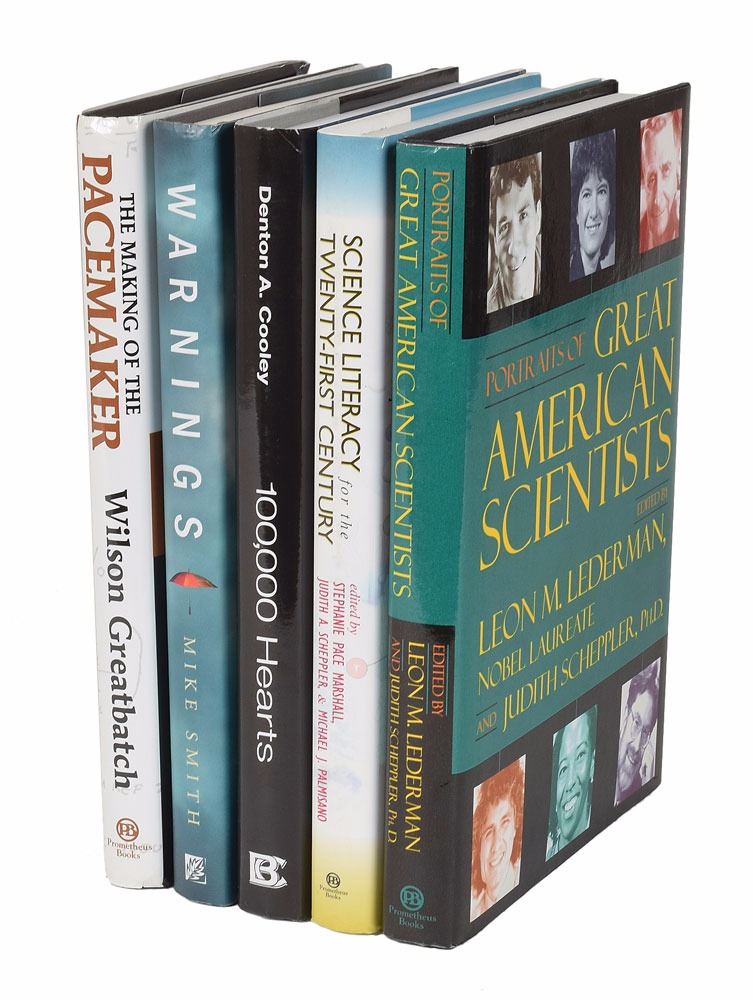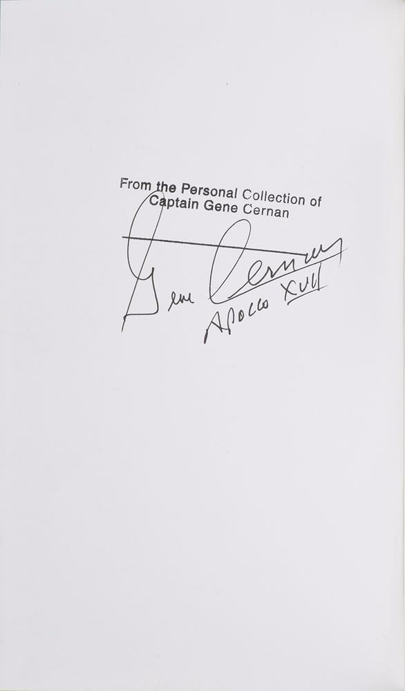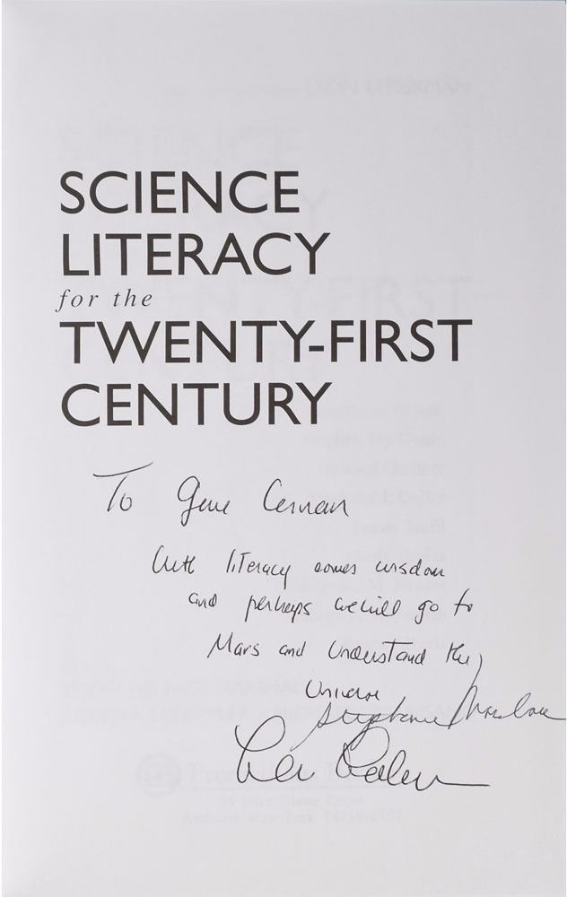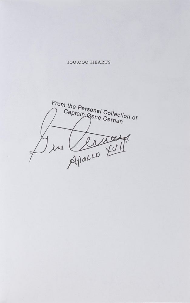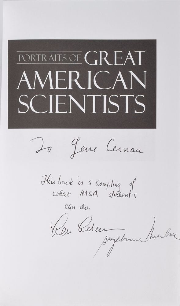 Group of five books from the personal collection of moonwalker Gene Cernan, each signed on an opening page or the front pastedown in ink below his ownership stamp, “Gene Cernan, Apollo XVII,” with each book signed and inscribed by the respective author or editor, including: Wilson Greatbatch, Mike Smith, Stephanie Pace Marshall (2), Denton A. Cooley, and one other. Titles include: The Making of the Pacemaker; Warnings: The True Story of How Science Tamed the Weather; Science Literacy for the Twenty–First Century; Portraits of Great American Scientists; and 100,000 Hearts: A Surgeon’s Memoir. In overall fine condition. Originating from the Astronaut Scholarship Foundation, a portion of the proceeds for the sale of these items will be donated to the ASF.