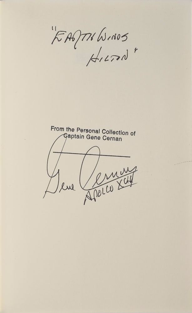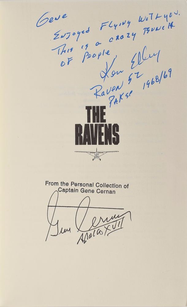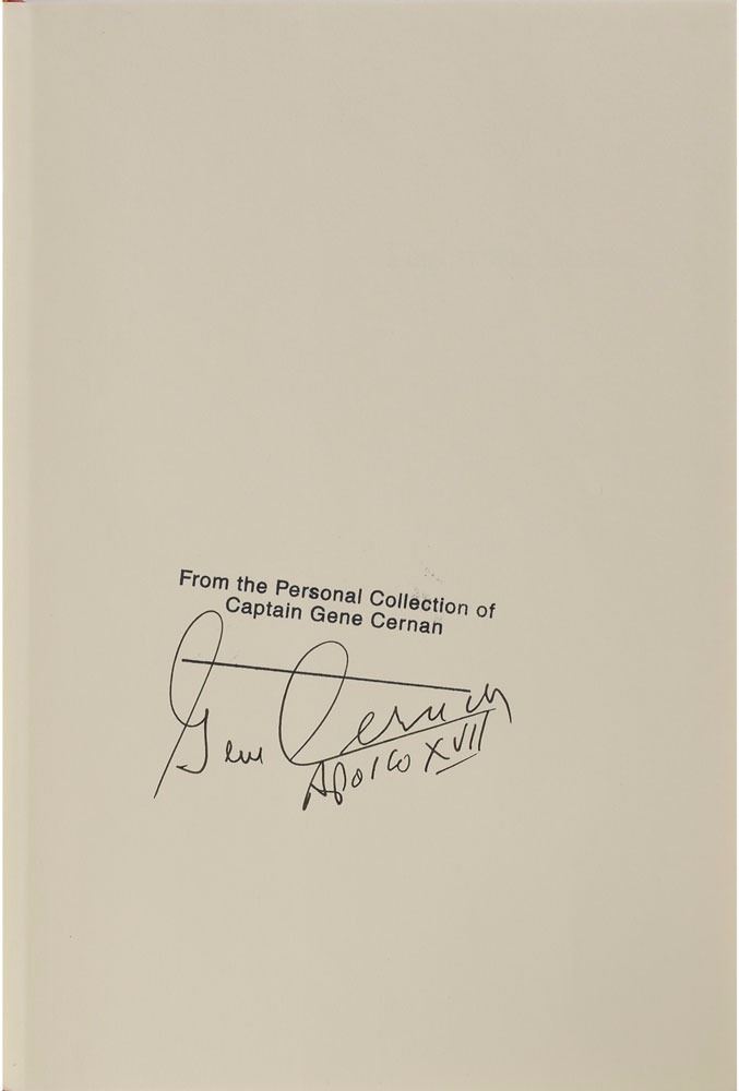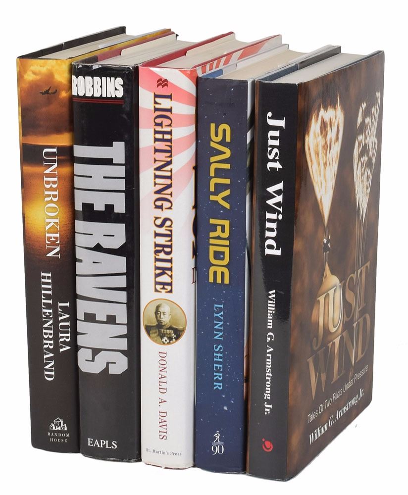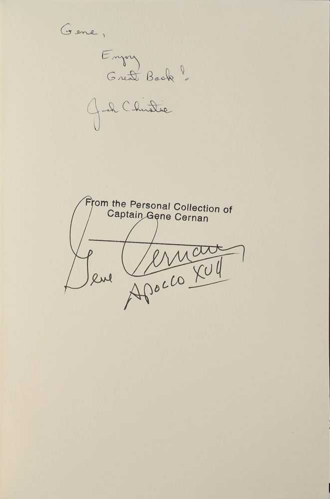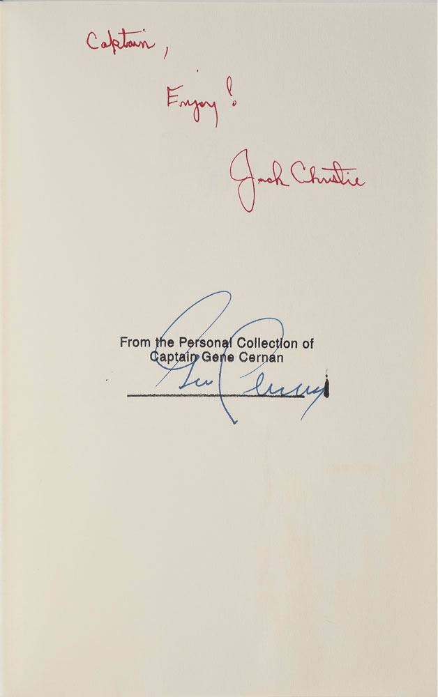 Group of five books from the personal collection of moonwalker Gene Cernan, each signed on an opening page or the front pastedown in ink below his ownership stamp, “Gene Cernan, Apollo XVII,” with three books signed and inscribed by the respective subject or friend, including: Jack Christie (2) and Ken Ellery. Titles include: Sally Ride: America’s First Woman in Space; Just Wind: Tales of Two Pilots Under Pressure (with Cernan adding “’Earth Winds Hilton’”); The Ravens: The Men Who Flew in America’s Secret War in Laos (which Cernan has signed twice); Lightning Strike (which features a Post-It annotated by Cernan, “’Last Man on the Moon’ Co–Author Don Davis”), and Unbroken. In overall fine condition. Originating from the Astronaut Scholarship Foundation, a portion of the proceeds for the sale of these items will be donated to the ASF.