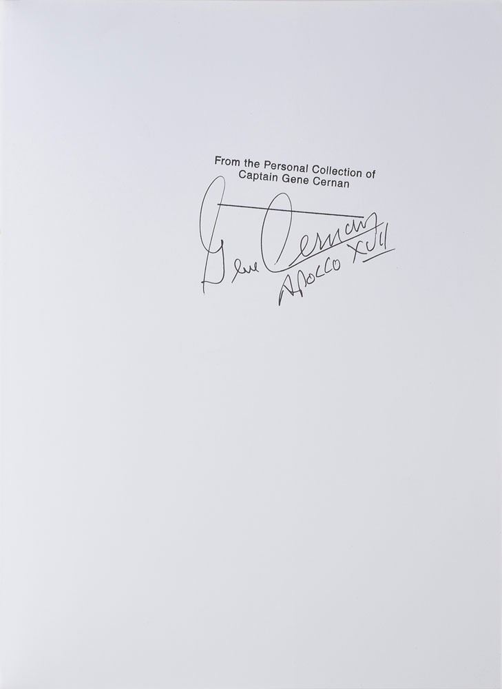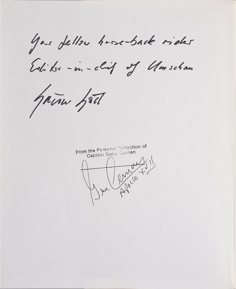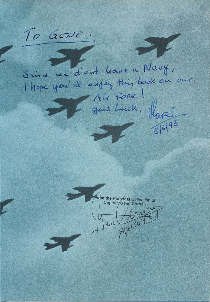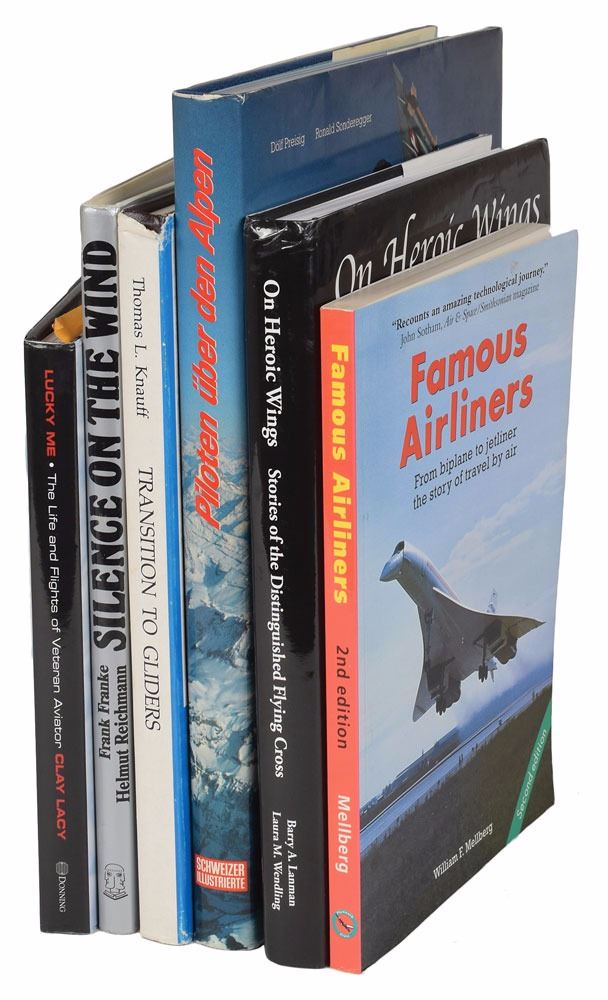Group of six books from the personal collection of moonwalker Gene Cernan, each signed on an opening page or the front pastedown in ink below his ownership stamp, “Gene Cernan, Apollo XVII,” with four books signed and inscribed by the respective author or subject, including: William Mellberg, Frank Franke and Helmut Reichmann, Clay Lacy, and one other. Titles include: Famous Airliners; Transition to Gliders: A Flight Training Handbook for Power Pilots; Silence on the Wind; Piloten Uber den Alpen (Pilots Over the Alps); Lucky Me: The Life and Flights of Veteran Aviator; and On Heroic Wings: Stories of the Distinguished Flying Cross. In overall very good to fine condition, with some wear to the dust jackets. Originating from the Astronaut Scholarship Foundation, a portion of the proceeds for the sale of these items will be donated to the ASF.