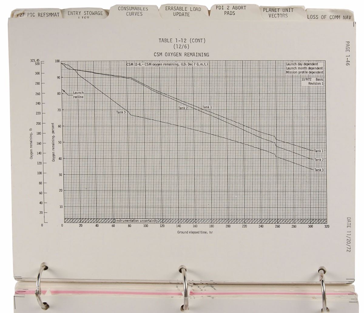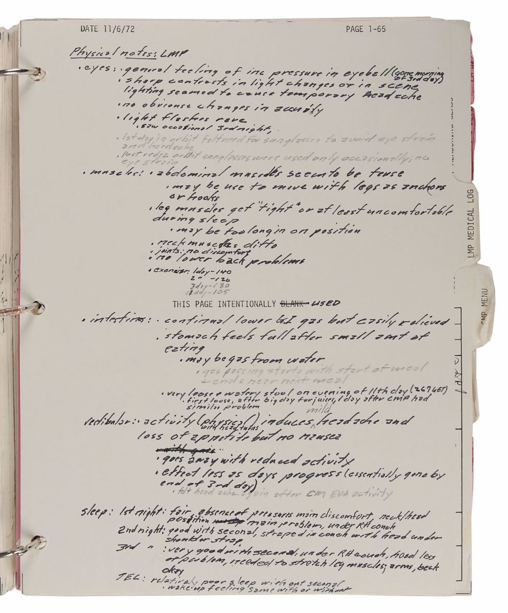 Used by the entire crew of Apollo 17, this flight plan supplement was routinely referenced to locate various pieces of equipment in the stowage lockers within the America spacecraft. Containing a host of charts and checklists, such as the ‘Transfer After Docking” section that confirmed all the necessary items that needed to be transferred to the command module prior to jettisoning the lunar module, the manual is highlighted by the abundant notes related to the crews food menu and medical log pages, in particularly Schmitt’s impressive breakdown of his physical condition; these notes would be instrumental in assisting the crew during mission debriefing once back on Earth. A phenomenal, highly fascinating manual used extensively over the course of the final Apollo mission.