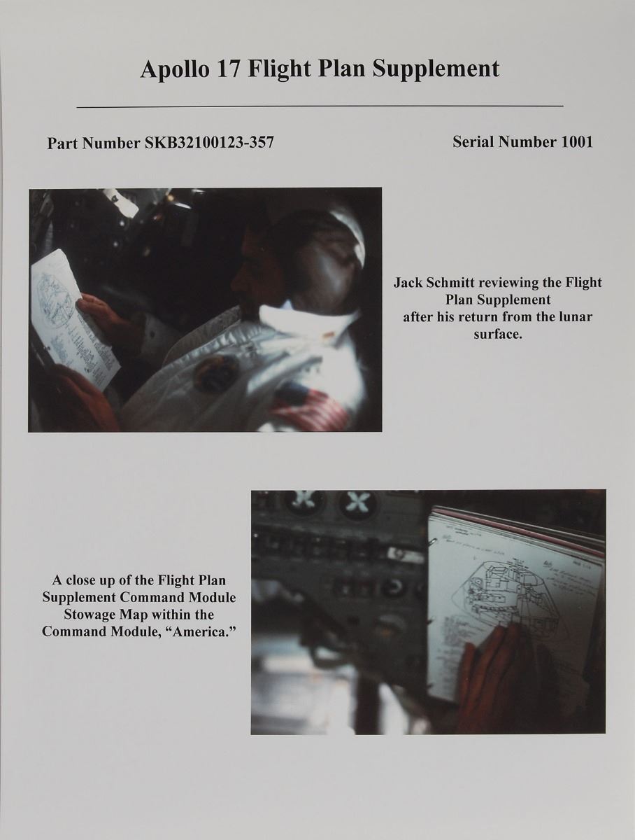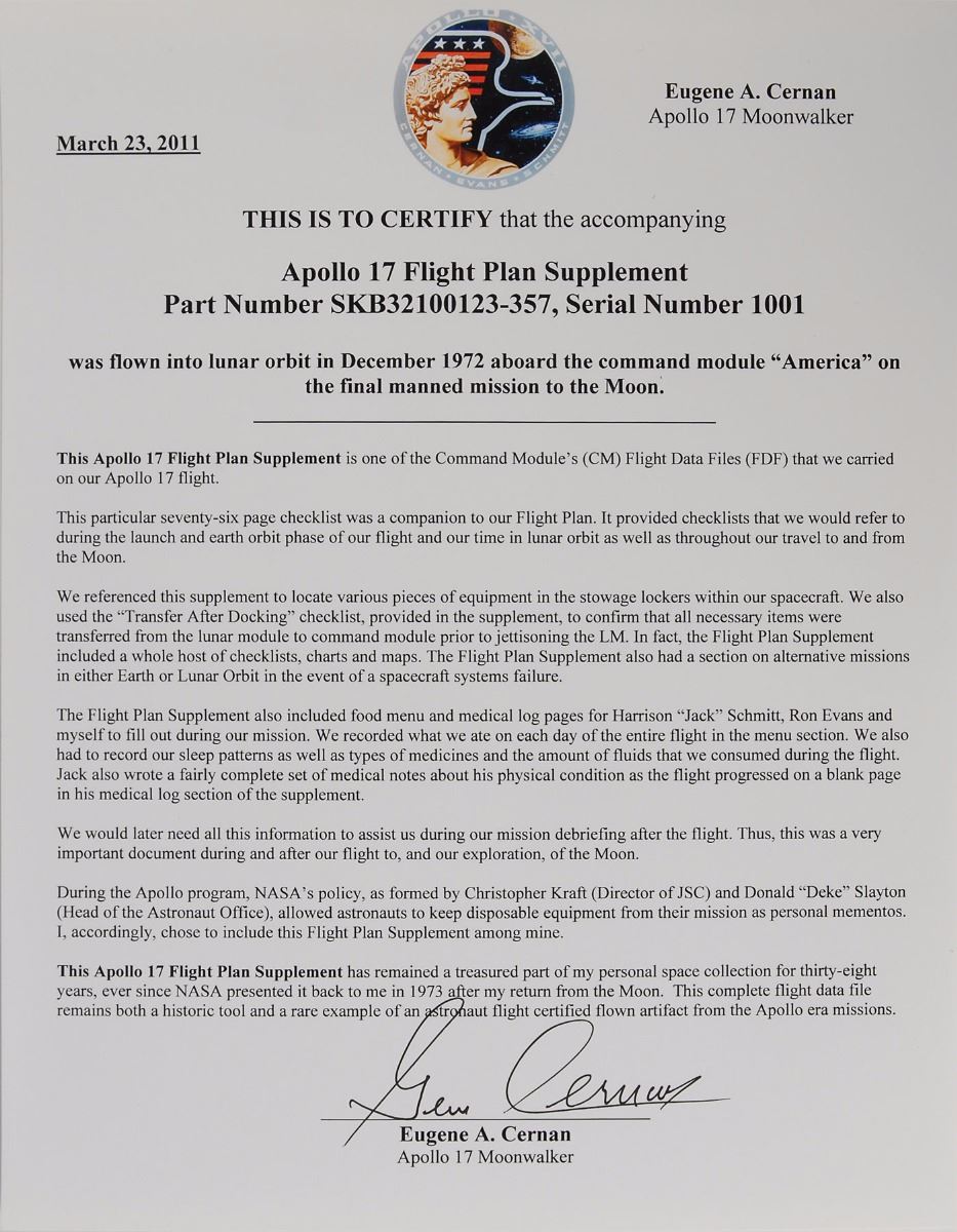 Gene Cernan’s ring-bound flown Flight Plan Supplement manual carried aboard command module America during the Apollo 17 mission, 8.5 x 10.5, approximately 76 pages (both sides), signed and flight certified on the front cover in blue felt tip, “Flown on Apollo XVII, Eugene Cernan,” with a provenance stamp to the upper portion. The manual, Part No. SKB32100123–357, S/N 1001, and dated November 20, 1972, was used as a companion to the main flight plan, and provided checklists that the crew would refer to during phases such as launch, earth orbit, lunar orbit, and the journey to and from the moon. The manual is divided into several sections and are tabbed accordingly: “Launch Stowage,” “Orbital Stowage,” “Planet Unit Vectors,” “Consumables Curves,” “Mission Rules,” and medical logs and menus for CMP and CDR. Additionally, the manual features copious amounts of handwriting in pencil and ink by all three crew members, varying from check marks and simple notes to detailed descriptions of daily eating routines and physicals checkups, in part: “Physical notes: LMP, eyes: general feeling of inc pressure in eyeball (gone morning of 3rd day), sharp contrasts in light changes or in scene, lighting seemed to cause temporary headache…muscles: abdominal muscles seem to be tense…leg muscles get ‘tight’ or at least uncomfortable during sleep, may be too long in one position…intestines: continual lower G. I. gas but easily relieved, stomach feels full after small amt of eating, may be gas from water.” In fine condition, with some rust marks to cover and a few pages detached. Accompanied by a signed two-page letter of certification from 2011 that shows Cernan holding this very item, in part: “This Apollo 17 Flight Plan Supplement is one of the Command Module’s (CM) Flight Data Files (FDF) that we carried on our Apollo 17 flight…[It] has remained a treasured part of my personal space collection for thirty-eight years, ever since NASA presented it to me in 1973 after my return from the Moon.” Also accompanied by a copy of a tape transcript mentioning the supplement manual, as well as a sheet showing two images of LMP Harrison Schmitt reading the manual while in orbit.