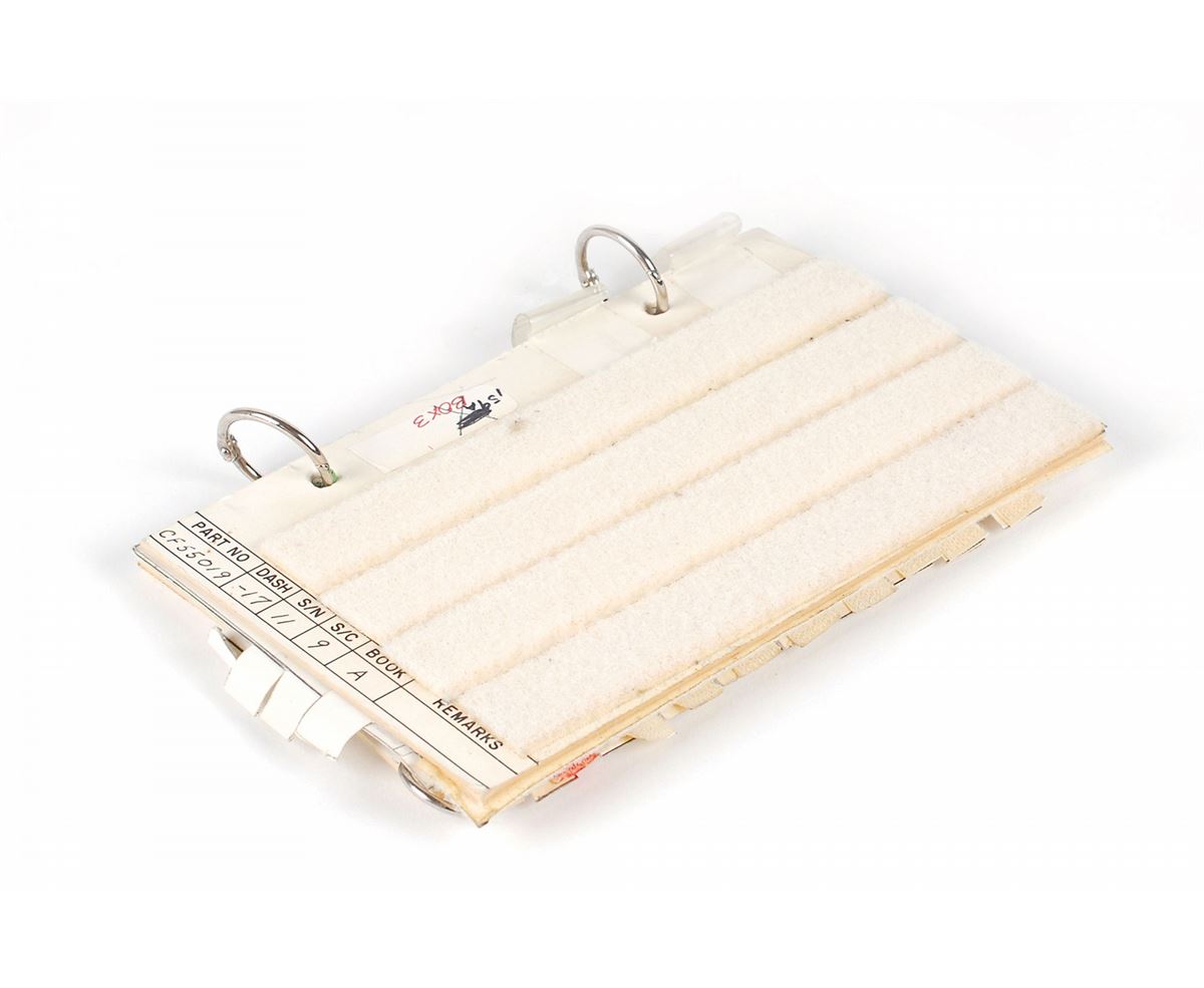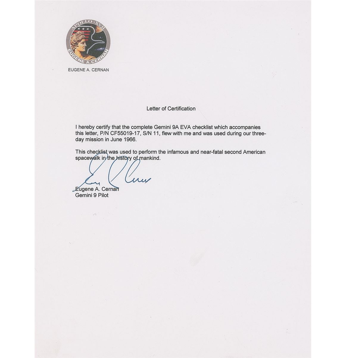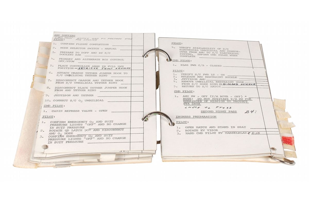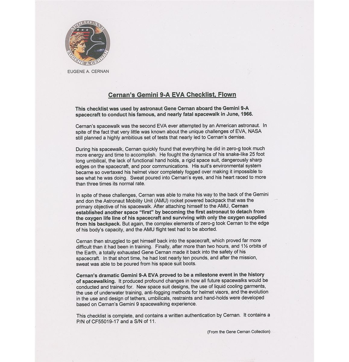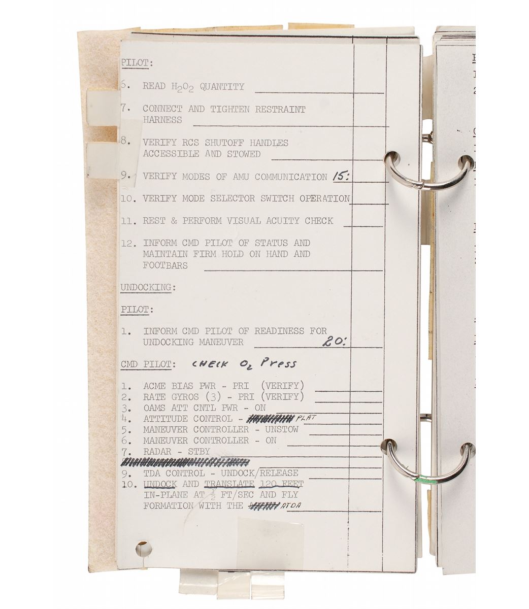 Important flown complete extravehicular activity checklist used on Gemini 9A, consisting of eleven double-sided cardstock pages bound with two metal rings, 5 x 8, labeled on the front: “Part No CF55019, Dash -17, S/N 11, S/C 9, Book A.” Annotated on about half of the pages in Cernan's hand, the checklist outlines the tasks for his EVA, the primary goal of which was connecting to and testing the Astronaut Maneuvering Unit (AMU) rocket-powered backpack. The procedures for connecting to the AMU appear on the third page and fourth pages beneath the heading "Adapter Preparation & AMU Inspection," under which Cernan has written "Check O2 Press," a notation that appears several more times throughout the checklist. Following the instructions for the intended testing of this new equipment is a notation reading "Perform Rescue Mission." Each page bears an affixed Velcro tab that would attach to a strip inside the front cover as they were turned. Both the front and back covers also bear several affixed Velcro strips. Expected light wear from use, and some Velcro tabs partially detached, otherwise fine condition.