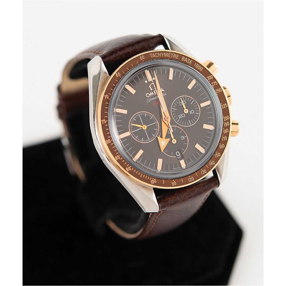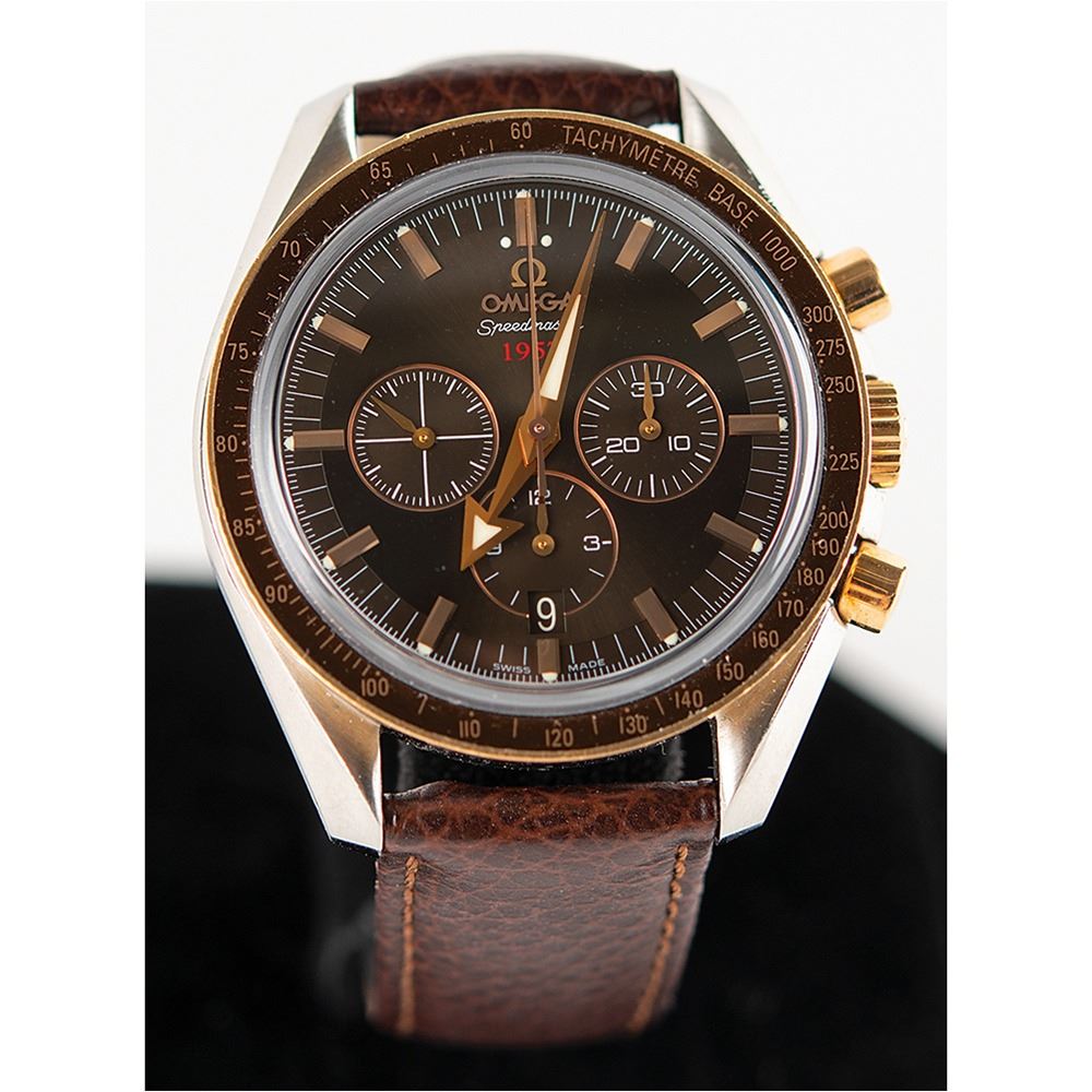 The Omega Speedmaster is steeped in history as the original 'Moon Watch,' extensively tested and qualified by NASA for use on the lunar surface. This special anniversary model, honoring the debut of the Speedmaster in 1957, and imbued with luxurious hues of brown, red gold, and silver, is an exceptionally desirable watch in its own right. That it was presented to Apollo 17 moonwalker Gene Cernan, recognizing his heroic achievements as an astronaut, makes it that much more remarkable.