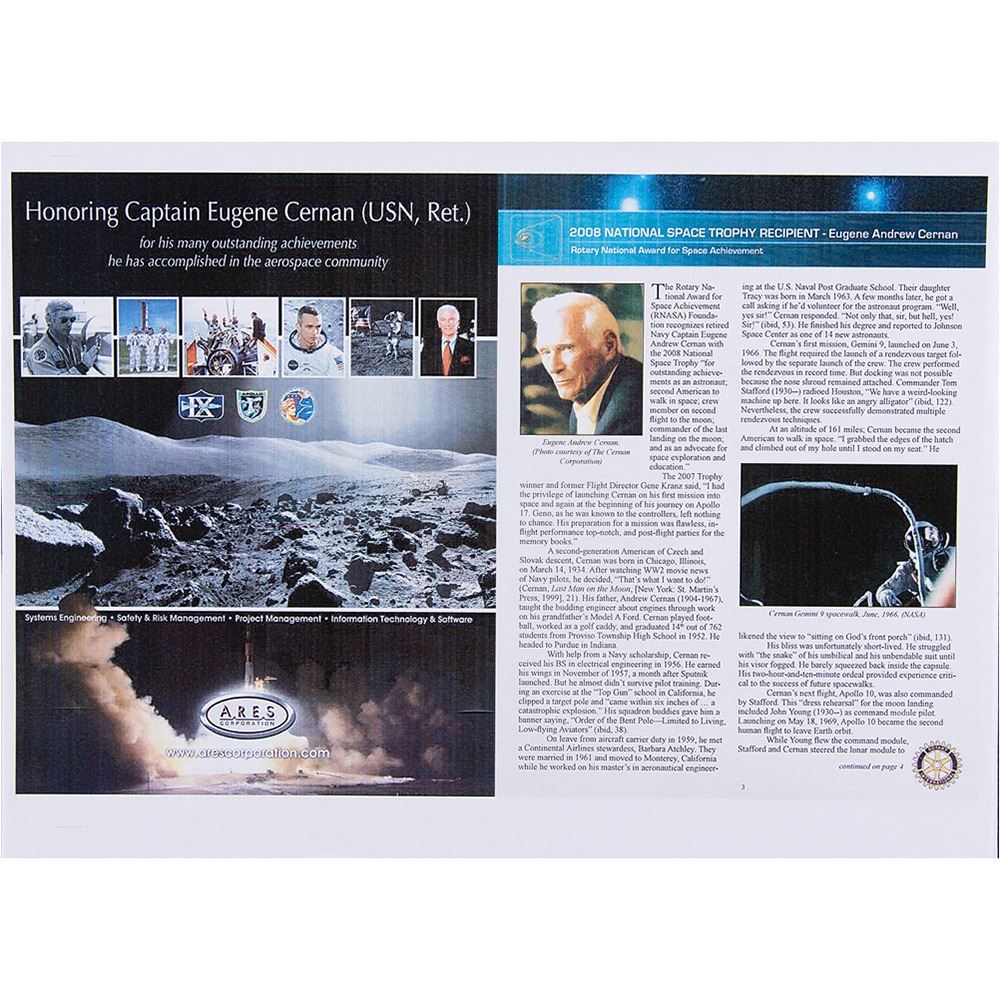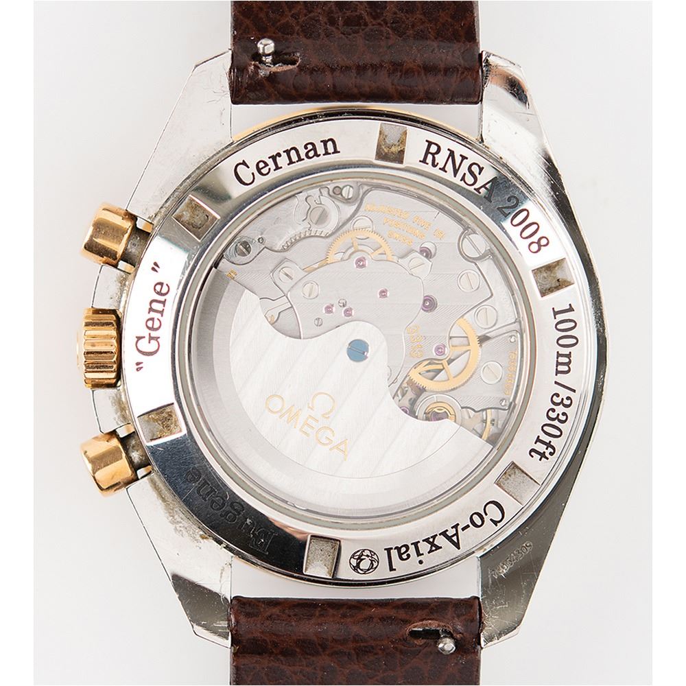 Gene Cernan's personally-owned and -worn Omega Speedmaster Broad Arrow 1957 steel-and-red gold chronograph wristwatch, presented to him as part of his 2008 Rotary National Award for Space Achievement, and engraved on the caseback, "Eugene 'Gene' Cernan, RNSA 2008." The distinctive timepiece features a brown dial graced by a small seconds sub-dial, 30-minute recorder and 12-hour recorder along with a central chronograph and 'broad arrow' hour and minute hands, as well as a scratch-resistant sapphire crystal. There is a date window at the 6 o‰Ûªclock position. The 18K red gold bezel, with its tachymetric scale and 18K red gold pushers and crown, is mounted on a 42 mm stainless steel casebody and presented on a brown leather strap. At the heart of this timepiece is the self-winding Co-Axial calibre 3313 which is visible through the transparent caseback. In fine condition. Accompanied by a booklet documenting Cernan's receipt of the 2008 Rotary National Award for Space Achievement (for which Omega Watches was a sponsor), as well as some images of Cernan wearing the watch; it is seen on his wrist during an interview in the 2014 documentary film The Last Man on the Moon.
