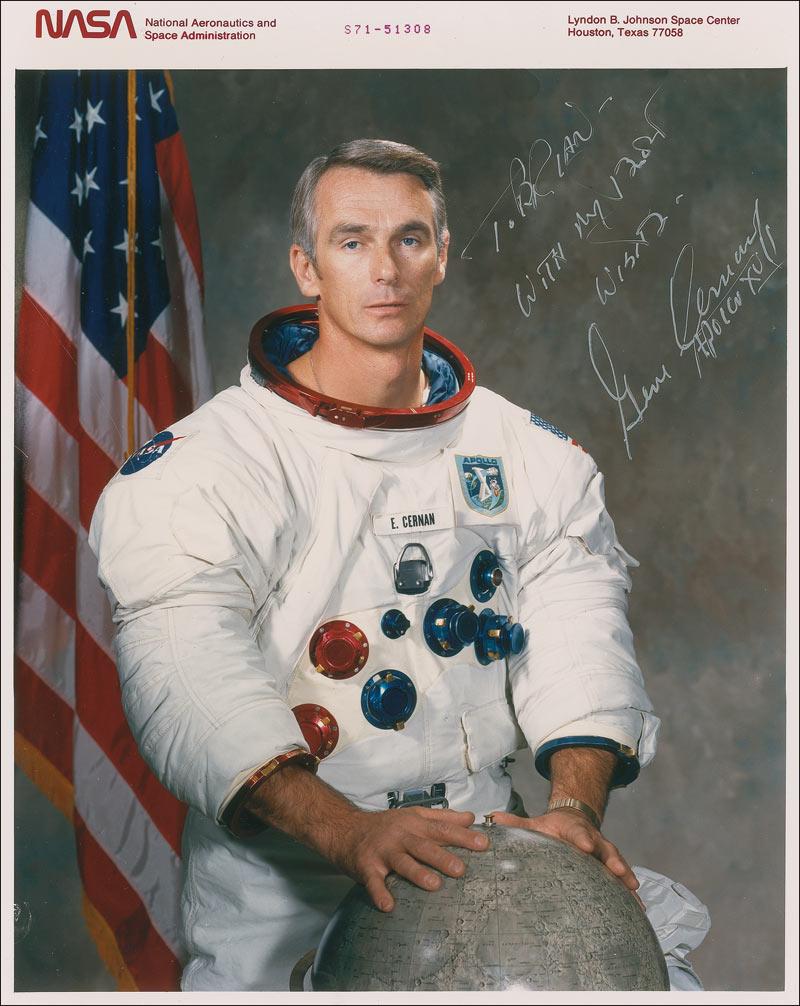 Color satin-finish 8 x 10 ‘red-numbered’ NASA photo of Cernan in his spacesuit, signed and inscribed in silver ink “To Brian, With my best wishes, Gene Cernan Apollo XVII.” In fine condition, with tape remnants along reverse top edge.