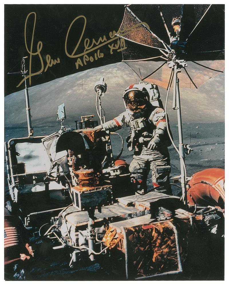 Vibrant color satin-finish 8 x 10 photo of Cernan near a lunar rover, boldly signed in gold ink “Gene Cernan, Apollo XVII.” In fine condition.