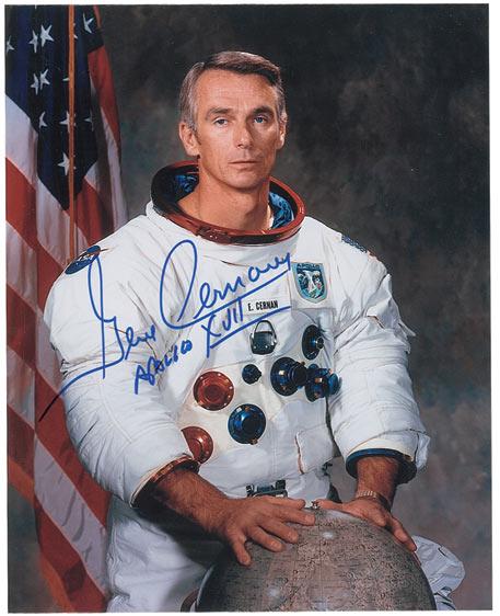 Color glossy 8 x 10 photo of Cernan in his spacesuit posing with a lunar globe, boldly signed in blue felt tip, “Gene Cernan, Apollo XVII.” In fine condition.