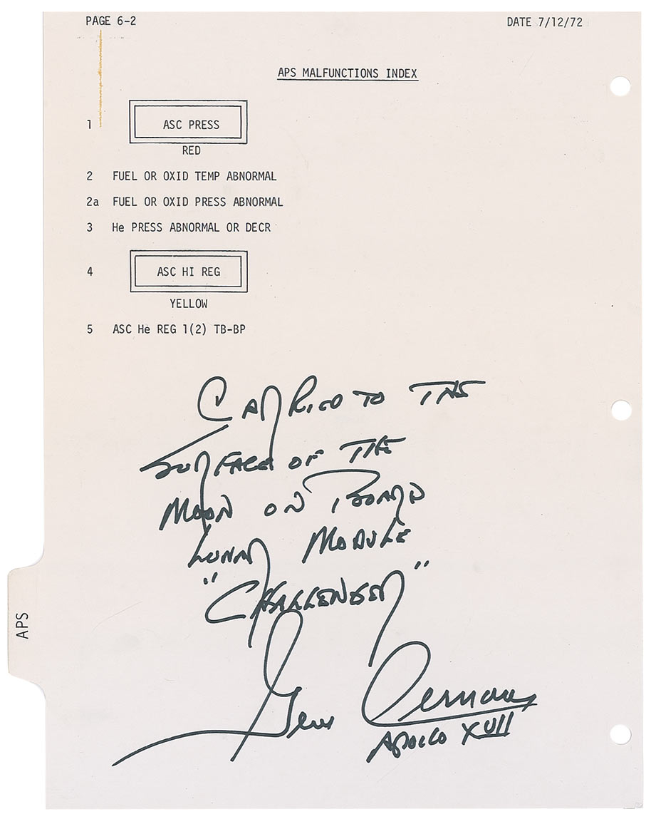 Printed Apollo 17 ‘APS Malfunctions Index,’ 8 x 10.5, numbered page 6-2. The page, flown to the lunar surface, is a flow chart instructing the crew of the procedure they should follow if the ascent engine in the lunar module failed to start when the time came to leave the moon. Signed at the bottom in black felt tip “Carried to the surface of the Moon on board lunar module ‘Challenger.’ Gene Cernan Apollo XVII.” In fine condition with three punch holes to the right side.