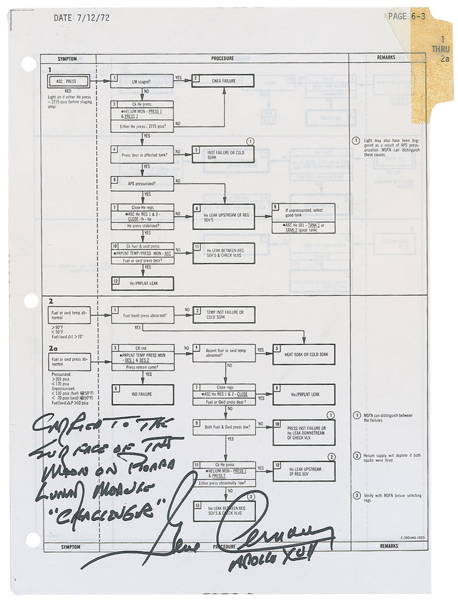 Original page from the malfunction checklist flown and used aboard the Apollo 17 mission, 7.5 x 10.5 with an integral file tab, signed in black felt tip “Carried to Surface of the Moon on Board Lunar Module ‘Challenger.’ Gene Cernan, Apollo XVII.” The two-sided sheet, dated July 12, 1972, includes procedural flow charts related to the operation of gas canisters and the like. Toning to tab and three punch holes along the left side, otherwise fine condition. A scarce and notable relic from America’s last manned moon mission to date!